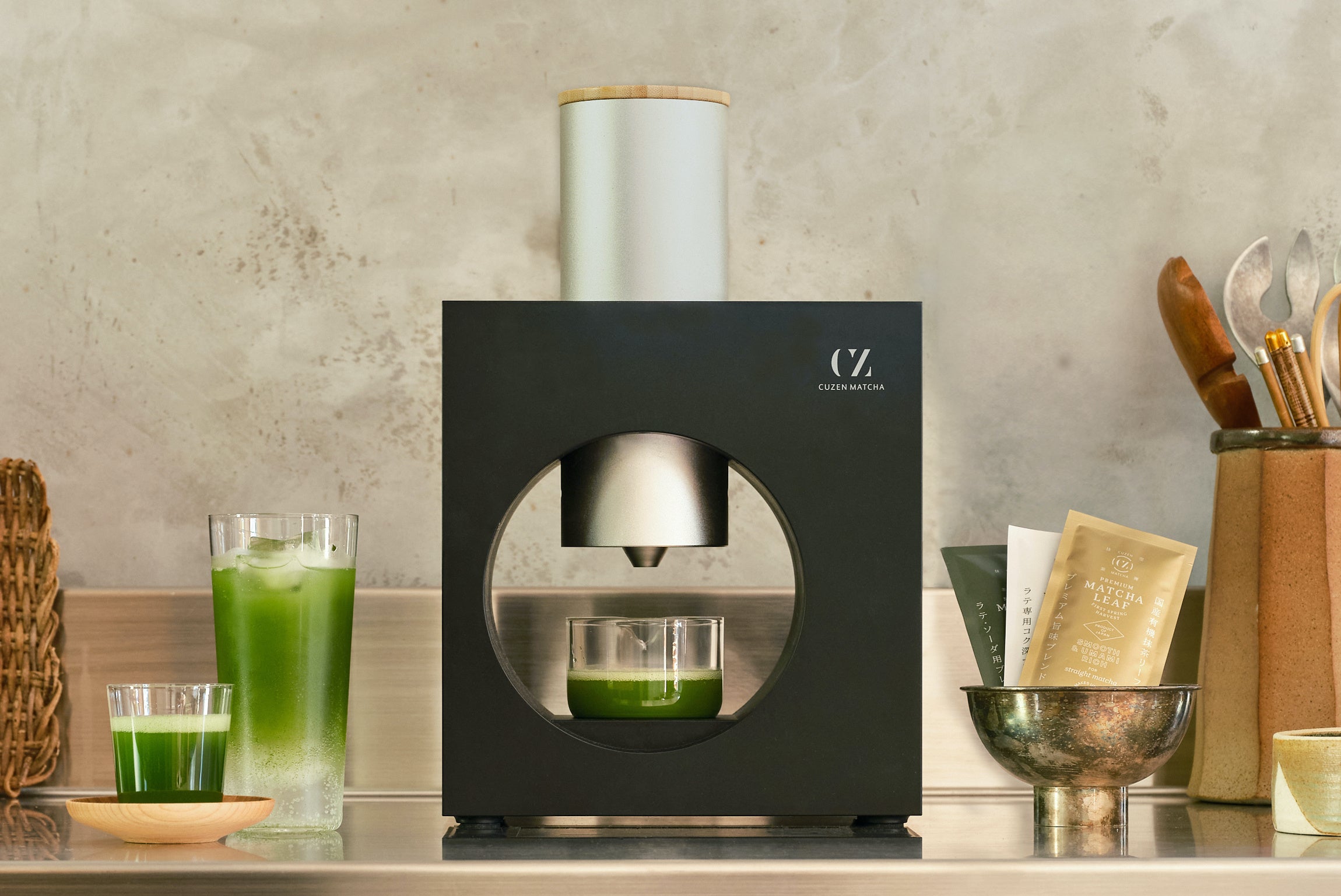 Cuzen Matchaとは、挽きたての抹茶を楽しむ抹茶マシンと100%オーガニックの国産抹茶リーフ(碾茶:抹茶の原料)から、最高峰の抹茶体験をお届けします。「簡単に抹茶を楽しみ、毎日のくらしを健康に」という茶葉の新たな需要を創出することで、日本の高品質なお茶の生産を守り、よりサスティナブルな社会を目指します。