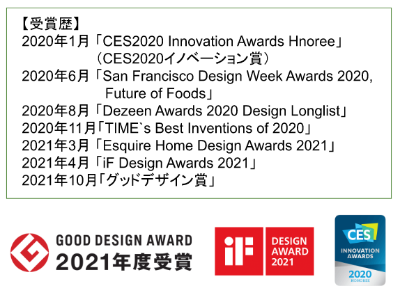 ・世界最大級の家電市CESでのイノベーション賞(米国)を皮切りに、米TIME誌が選ぶBest Invention賞(米国)、世界最大のデザイン賞 iF Design賞(独)、グッドデザイン賞(日本)など世界で7つの賞を受賞しています。