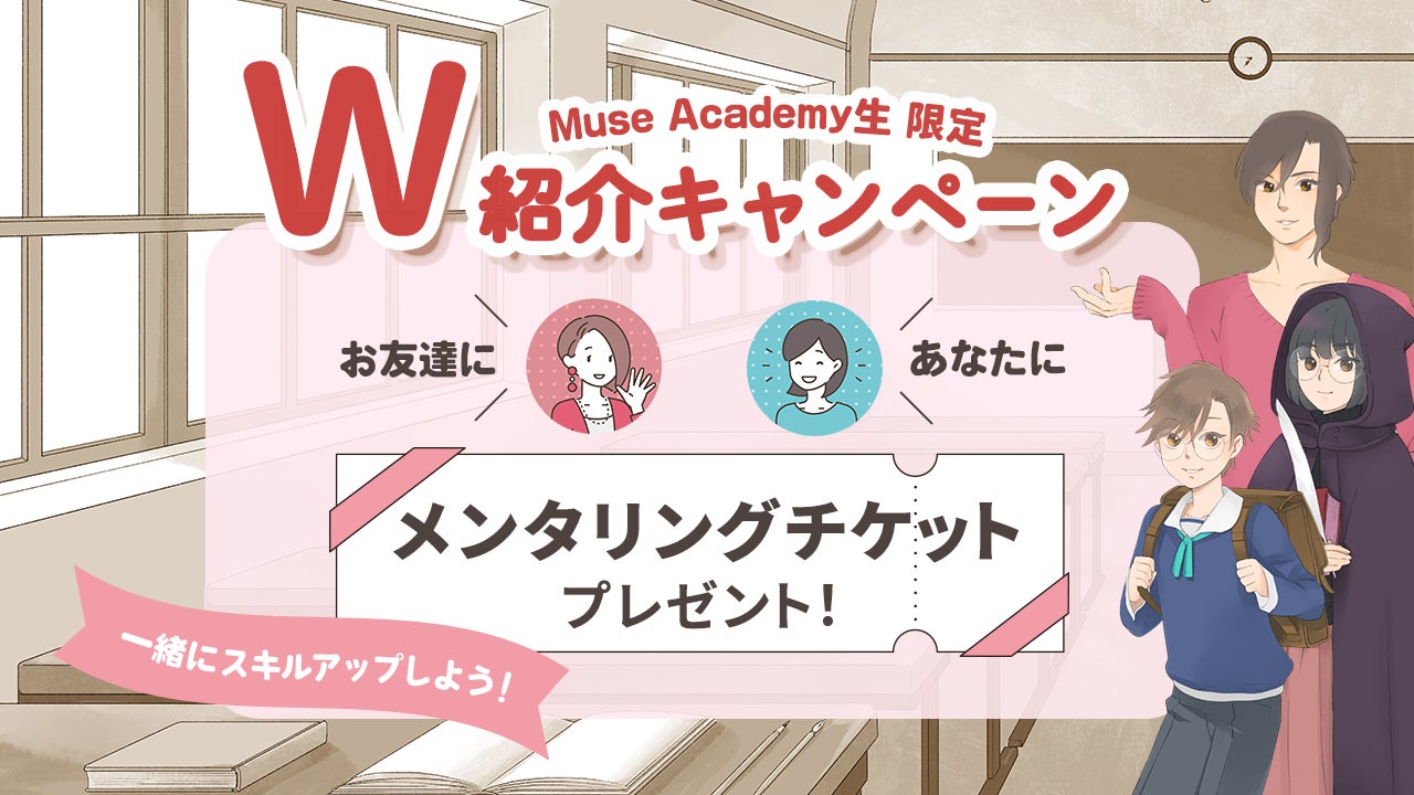 現役受講生のみなさん(アカデミー生・コミュニティ生共通)のご紹介でお友達がミューアカに新規入学された場合、紹介者と入学者のそれぞれに「メンタリングチケット」を1枚プレゼント!