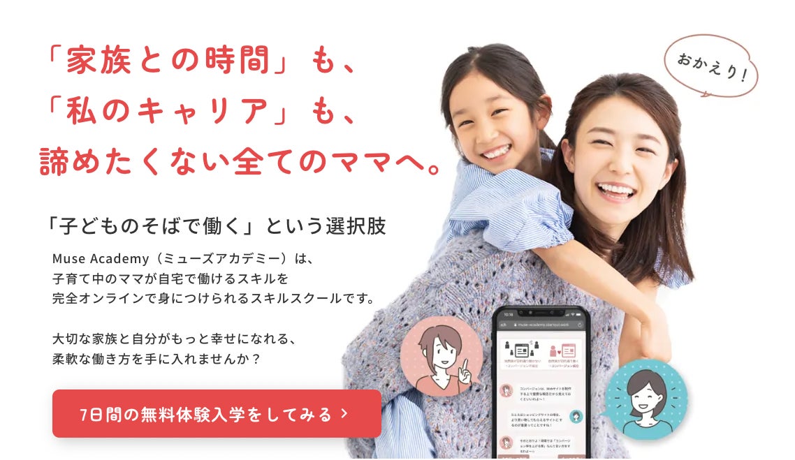 Muse Academy(ミューズアカデミー)は、女性がライフイベントに合わせて柔軟に働き方を選べる社会を目指す、完全オンラインで「ママが自宅でも・どこでも自由に働ける」スキルが学べるスクール&コミュニティです。
