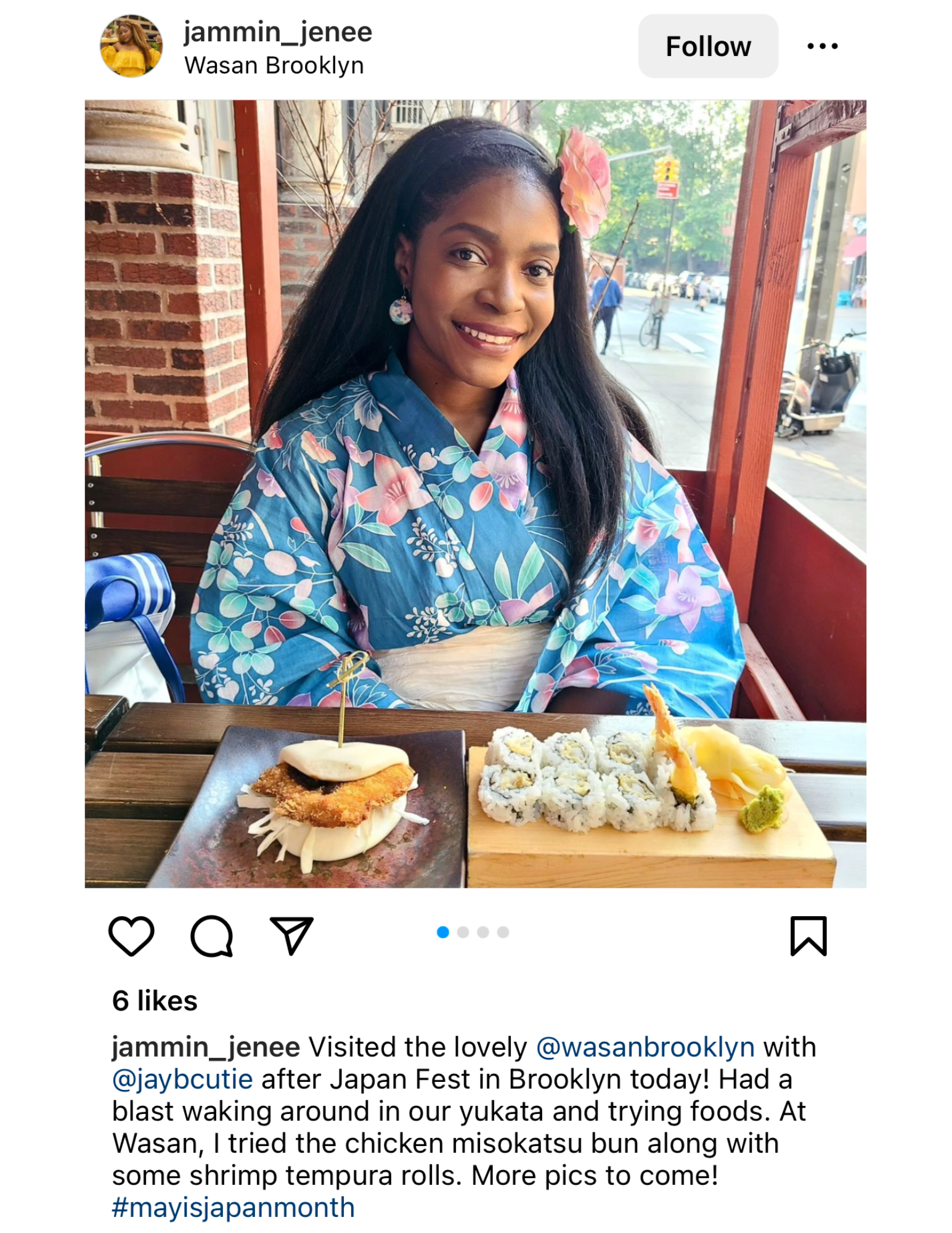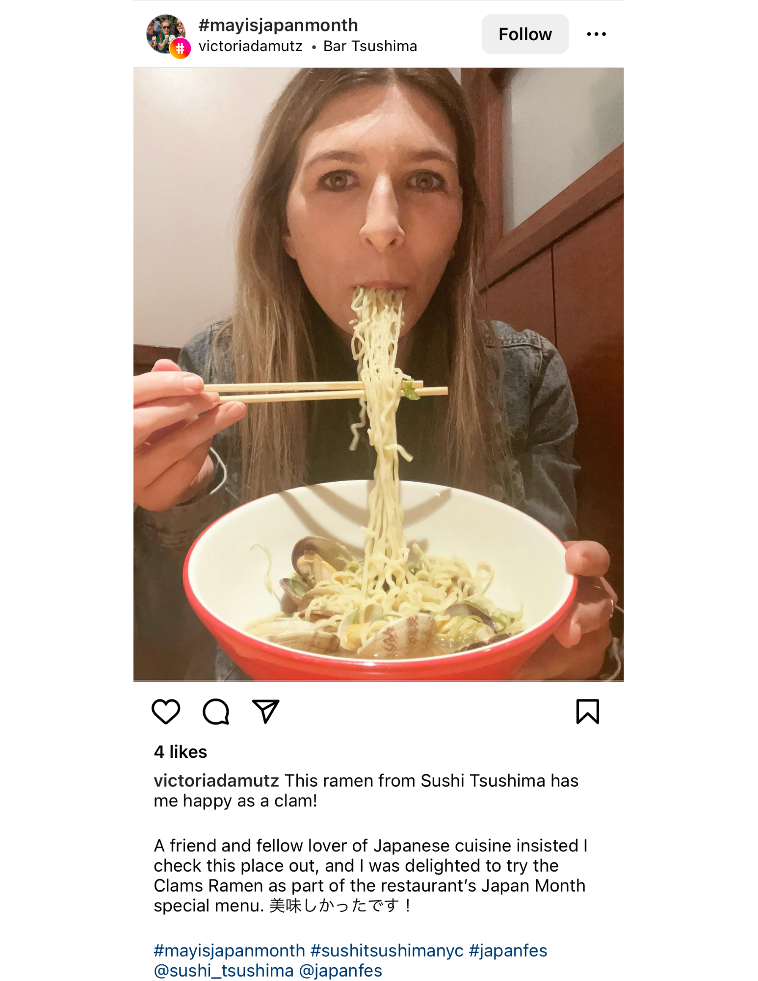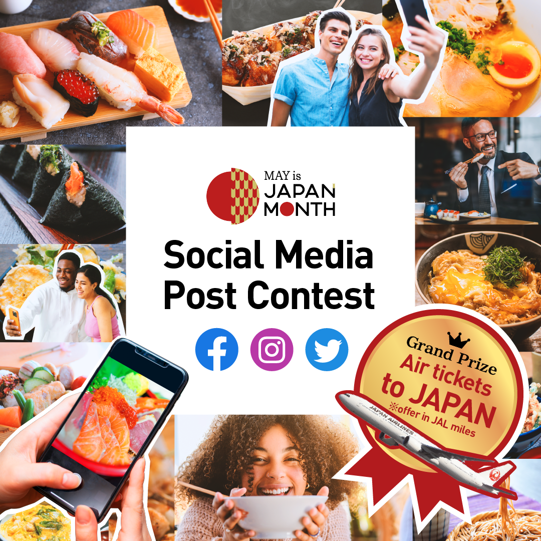 JAPAN MONTHのスタートを記念して、5月1日から31日まで、SNSコンテストが実施されました。参加者は、ニューヨーク市内のコンテスト協力レストランを訪れ、「We love Japanese food」というテーマを表現した、日本料理を楽しんでいる写真やおいしそうな料理の写真を撮影。「#MayIsJapanMonth」のハッシュタグを付けて個人のSNSアカウントに投稿し、期間中に集まった投稿の中から優勝者が選ばれるルールです。