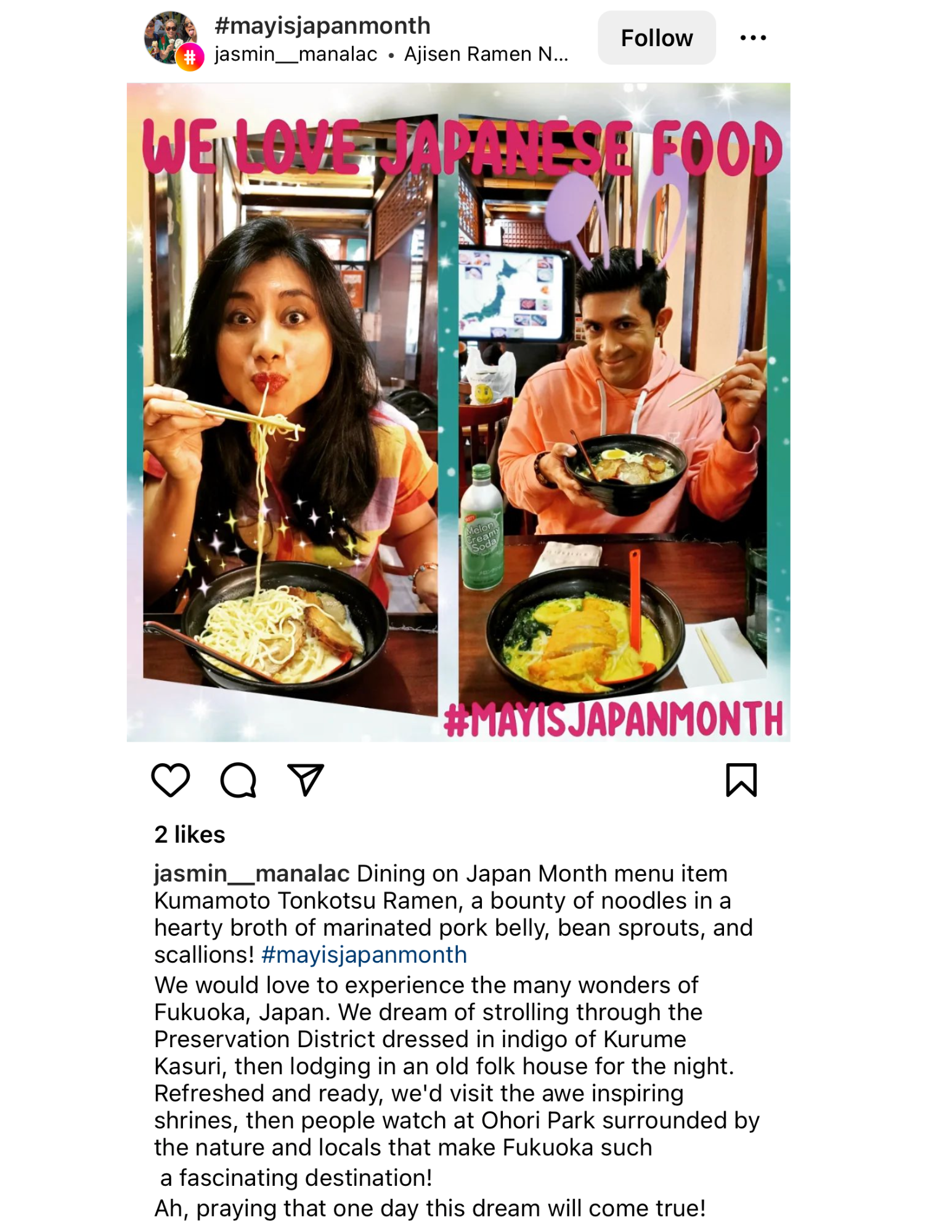 市内の日本食レストランを巡り、思い思いの方法で日本食への愛を表現した投稿を実施。「つけ麺」や「チキン南蛮」といった料理をキャンペーンを通じて初めて知った・食べたという参加者も見られ、地方料理の啓蒙を推し進めた結果となっています。