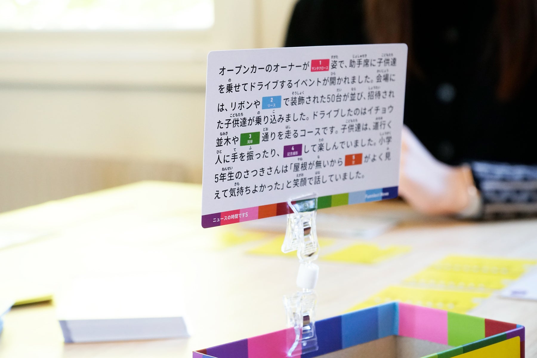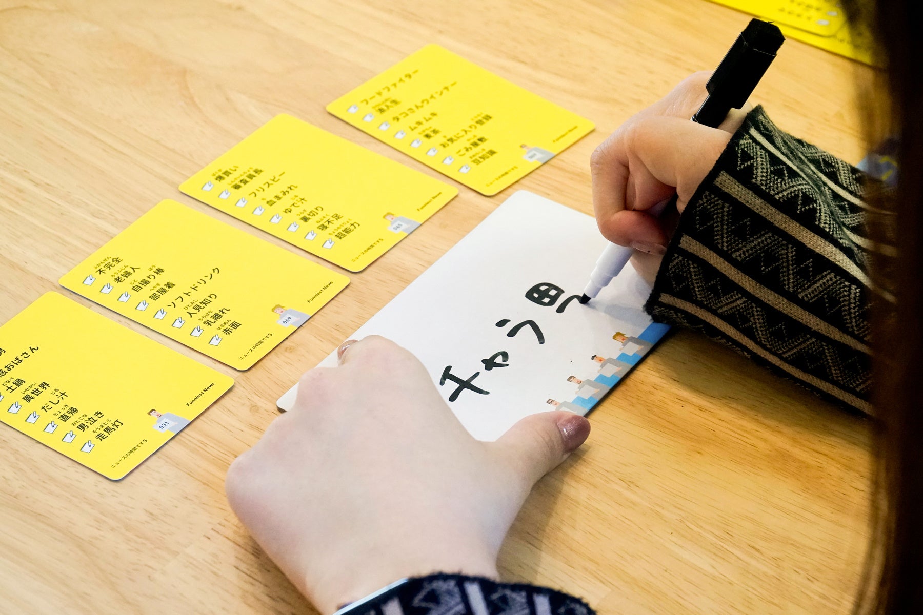 原稿の空欄にぴったりのワードを自分のワードカードから選んでカンペに書き、ニュースキャスターを笑わせよう!