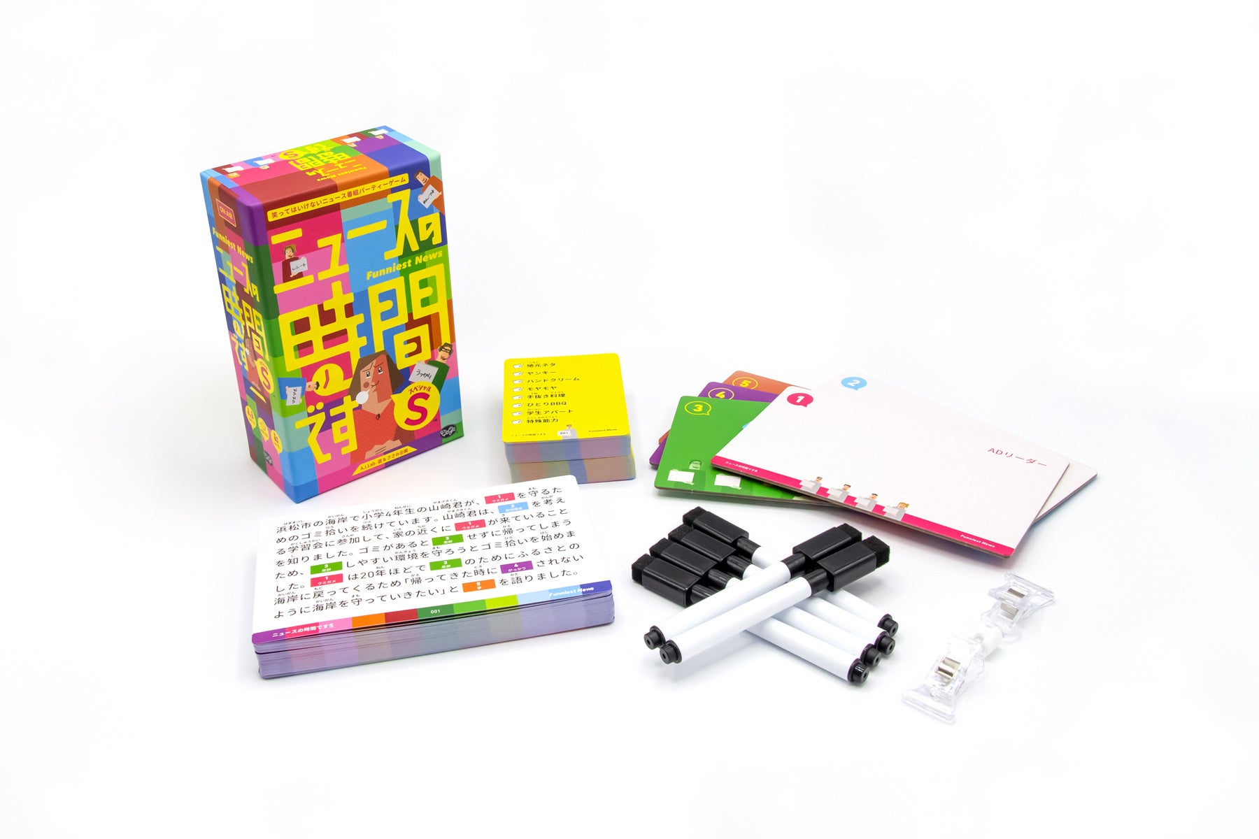 内容物:遊び方説明書 1部 / ワードカード 80枚 / 原稿カード 50本 / カンペボード 5枚 / ペン 6本 / カードクリップ 1個