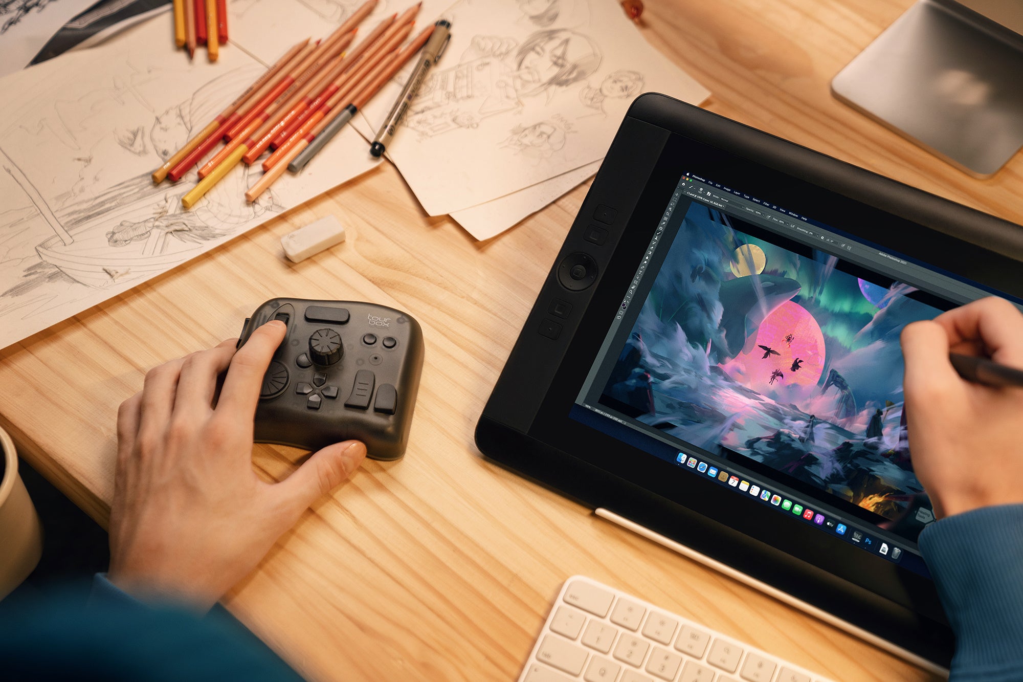『TourBox』には、各種ボタンのほか、「ノブ」や「スクロール」、「ダイヤル」などの回転させて操作するコントローラーが搭載されております。それらを使うことで、画像の拡大縮小、ブラシの太さ調節、パラメーターの細かな数値変更などが直感的に行えます。通常のキーボードでは不可能なアナログ操作を実現。またマウスやタブレットと組み合わせて使うこともでき、このおかげで制作時の効率を高めて、クリエイティビティを向上させます。