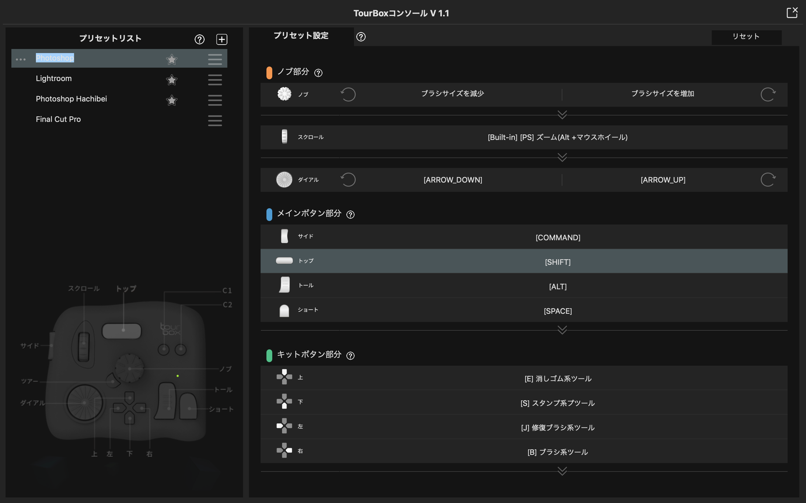 『TourBox』では、PCソフトのショートカットキーをユーザー自身がTourBox本体の各ボタンに割り振って操作できます。設定したボタンのプリセットは各ソフトごとに用意され、使用ソフトに応じて自動で切り替わります。また、設定したプリセットをクリエイター同士でシェアすることも可能。『Photoshop』と『Lightroom』は、あらかじめプリセットが用意されていますので、購入後すぐに使用できます。