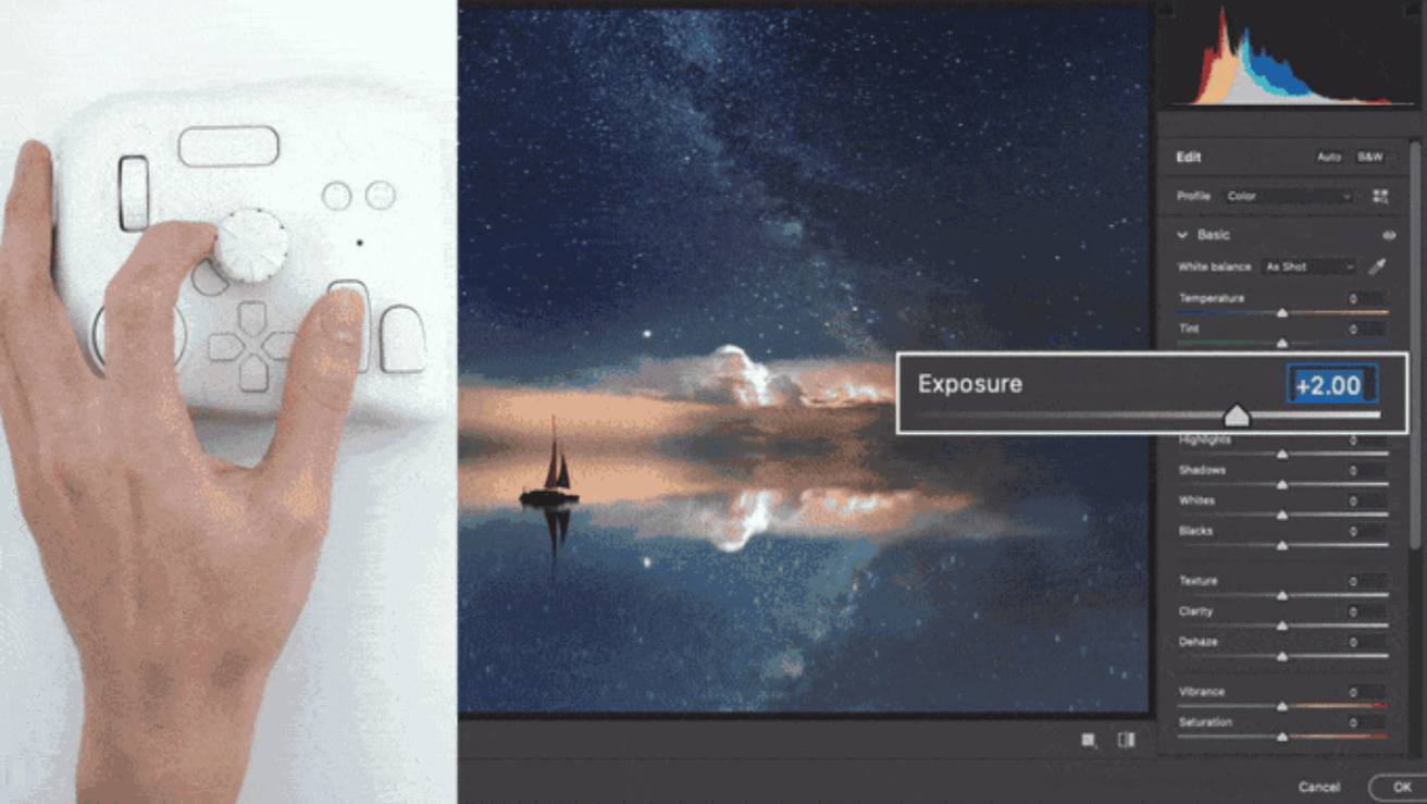 『Lightroom』や『Photoshop』、『Camera Raw』などの写真・画像編集ソフトにおいて、各種色味調整が『TourBox』を使うことで楽になります。従来は、露光やコントラスト、ハイライトなどのパラメーターのバーをマウスや矢印キーで増減を行っていたかと思います。それが『TourBox』のノブ(ツマミ)を回転させるだけで、すばやく増減でき、微妙な調整まで可能です。また、各種色調整の項目をスライダーで切り換えられるため、多数の写