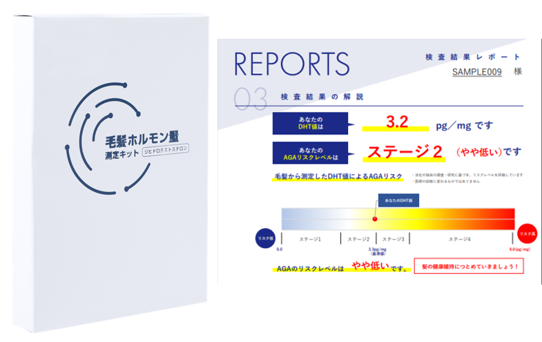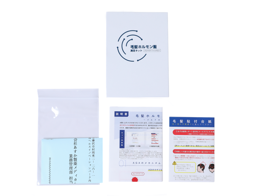 AGA検査キットとは、わずか5本の髪の毛を採取して返送用封筒にて検査機関へ送付することで、毛髪中のDHT量を測定でき、将来的にAGAによる薄毛を発症する可能性が把握できます。