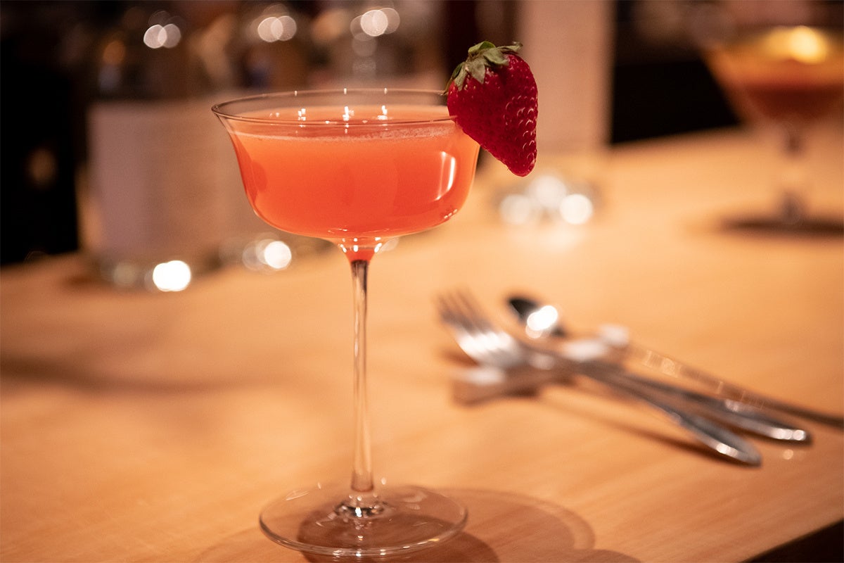 フレッシュなイチゴと華やかなバラを組み合わせた「イチゴとローズのカクテル」。バラ科のフルーツであるイチゴは、バラの花に近い芳香を持っているため相性抜群。カクテルに浮かべたバラの花びらが華やかさを添えます。イチゴの甘酸っぱい味わいとバラのロマンティックな香りのマリアージュをお楽しみください。