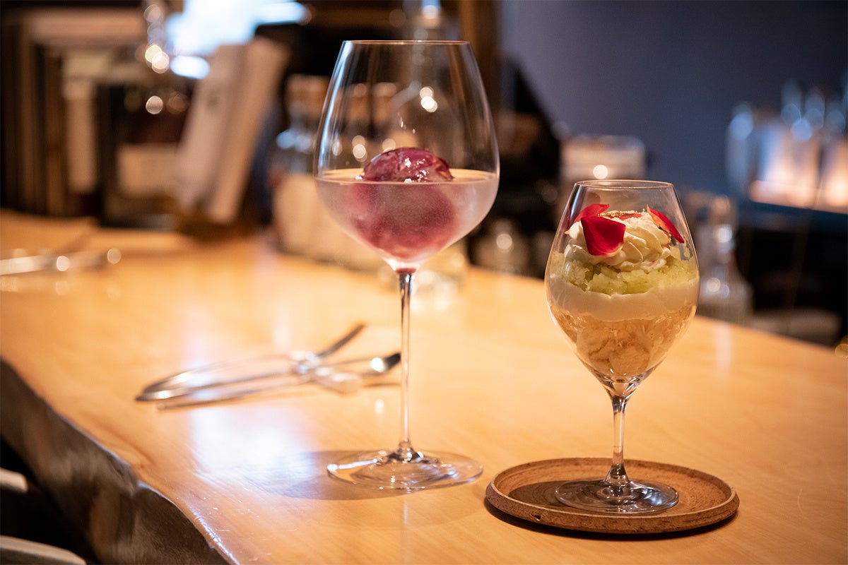 7種類以上のバラを使用して作ったローズスピリッツを最大限に生かした、まるでバラの花束のようなカクテル「ギフトローズフィズ」。バラの花びらを閉じ込めた華やかなボールアイスが溶けていくにつれ、グラスの中で香りが花開きます。ペアリングするのは、Otonamiのために考案された特別なパフェ。ライムと青リンゴの爽やかな味わいが特徴です。