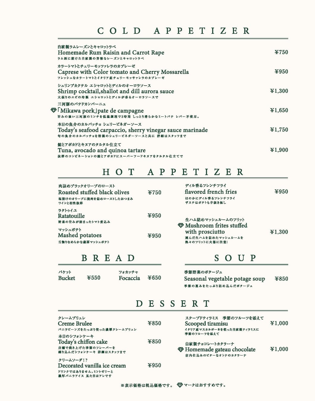 営業時間:月~日、祝日、祝前日: 11:00~15:00 (料理L.O. 14:00 ドリンクL.O. 14:00)