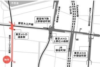 本物件の半径500m圏内には5駅あり、新幹線が通る東京駅や、つくばエクスプレスが通る秋葉原駅を経由することで、東北・北陸方面や北関東へもアクセスしやすいため、外訪や出張を予定する企業のオフィスニーズの高いエリアとなります。湯島は、アクセスが非常に良いうえ、都心と比べて賃料が比較的低い点もテナントが集まる理由の一つです。