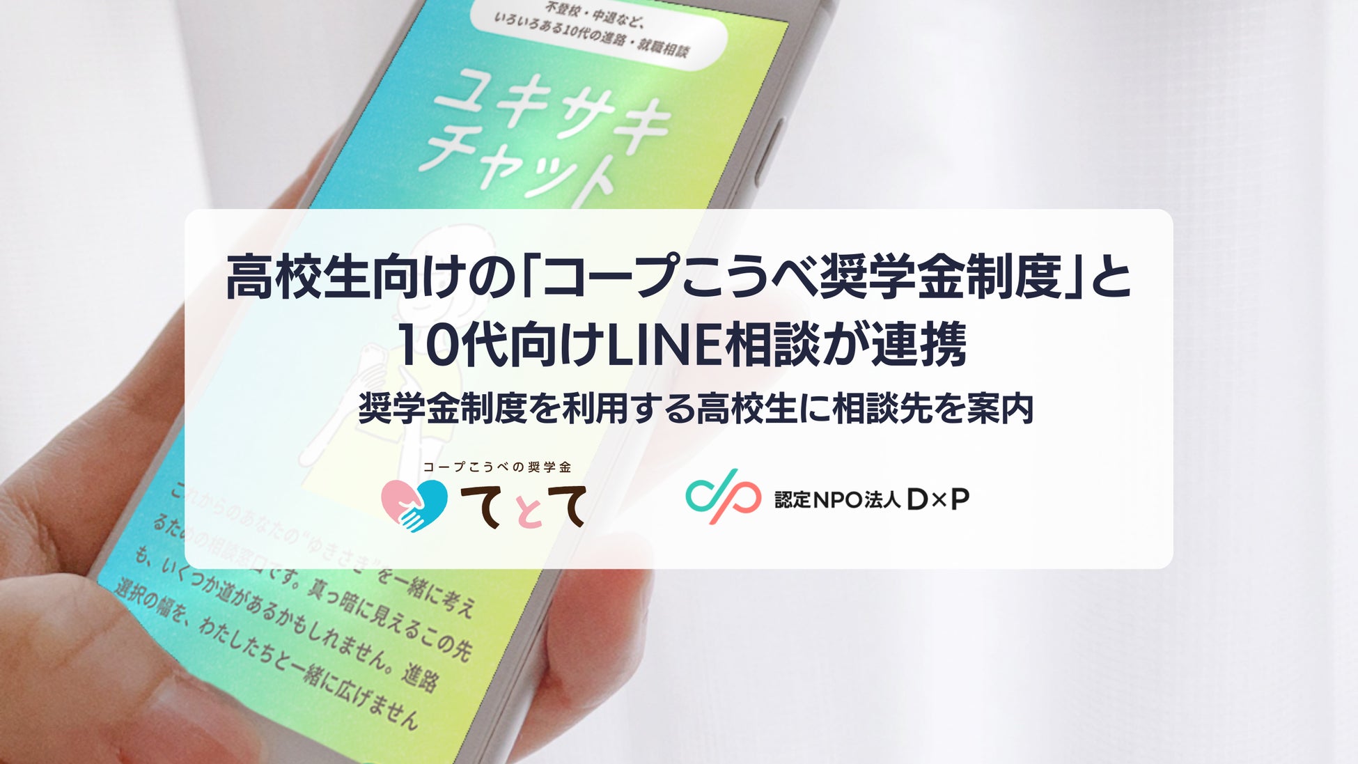 2022年8月24日(水)、全国の13〜19歳(コロナ禍では25歳まで)8,000名の登録者を抱えるLINE相談「ユキサキチャット」を運営する認定NPO法人D×P(ディーピー)(大阪市 理事長 今井紀明)は、一般財団法人コープこうべ奨学金財団(理事長 岩山 利久)と連携を開始。コープこうべ奨学金制度(愛称:てとて)を利用する高校生に、ユキサキチャットを案内し早期相談につなげます。
