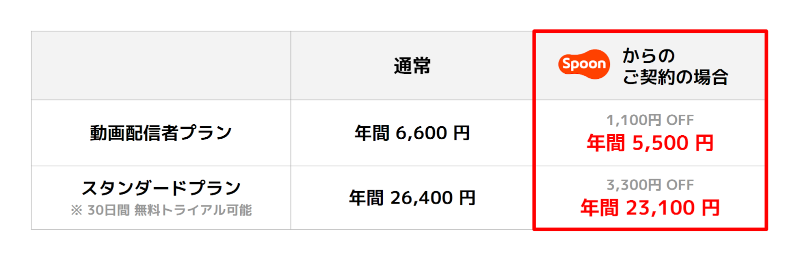 Spoonの紹介URLからご契約いただくことで、通常料金 年間26,400円(税込)から 3,300円(税込)分 割引となります。さらに、30日間の無料でお試しいただける「無料トライアル」もご利用可能となっております。