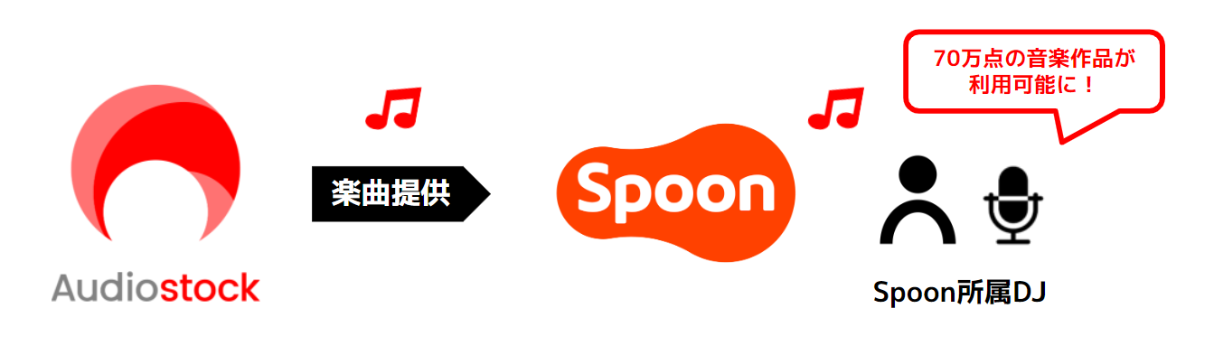 音声配信アプリ「Spoon」を運営する株式会社Spoon Radio Japan(本社:東京都千代田区、代表取締役:崔 赫宰、以下「弊社」)は、株式会社オーディオストック(岡山市北区、代表取締役社長:西尾 周一郎)が運営する世界最大級のストックミュージックサービス「Audiostock」と提携し、Spoon所属DJ約50名へ、AudiostockのBGM / 効果音 / ボイス / 歌もの楽曲の提供をいただくことをお知らせいたします。加えて全てのSpoonユーザー様を対象に、Audiostockをお得に利用開始できるキャンペーンも同時に開始し、音声配信において、権利面で安心して楽曲を使用できる環境をサポートいたします。