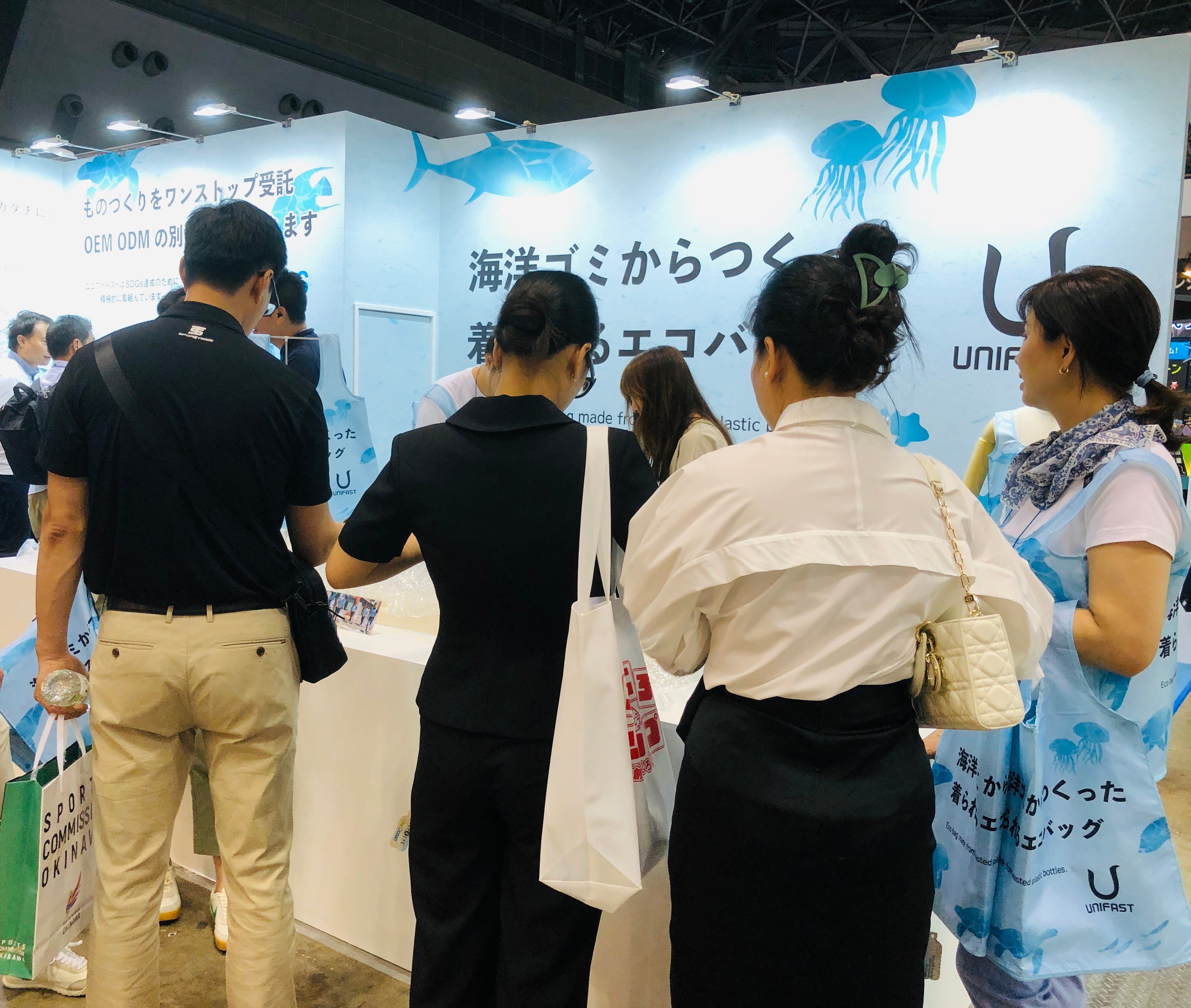 今年の5月に新型コロナウイルスが感染症法上の分類で「5類」に移行し、屋内外のマスク着用も緩和され、経済活動は徐々に正常化に向かっており、展示会場は賑わいを取り戻しています。多くの来場者が当社の『海洋ゴミからつくった着られるエコバッグ』に興味を示し、ブースの壁面に掲載したアップサイクル過程の図を見ながら、商品の紹介に熱心に耳を傾ける様子が伺えました。当社ブースに立ち寄った来場者からは「環境への貢献ができる製品に魅力を感じました」「素材が環境に優しいだけでなく、デザインも素晴らしいですね」「海洋ゴミ問題に対する解決策として、こういった製品が存在することを知って驚きました」など、たくさんの温かい声をいただき、大盛況の3日間でした。