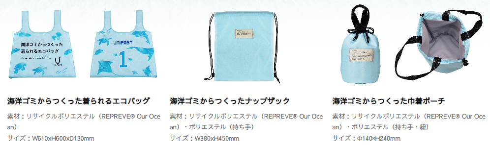 出展内容: 中国・東南アジアの沿岸で回収したプラスチックゴミからつくったリサイクル繊維である「REPREVE® Our Ocean」をつかった『海洋ゴミからつくった着られるエコバッグ』、『海 洋ゴミからつくったナップザック』、『海洋ゴミからつくった巾着ポーチ』を出展
