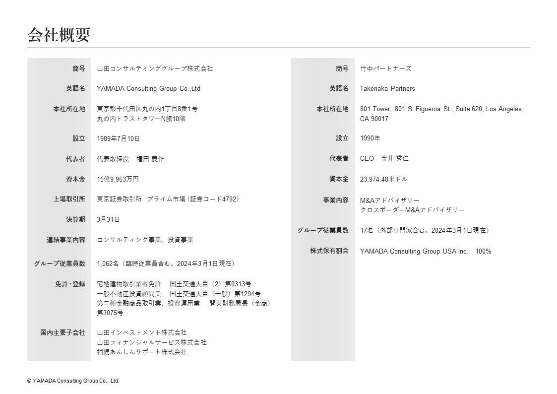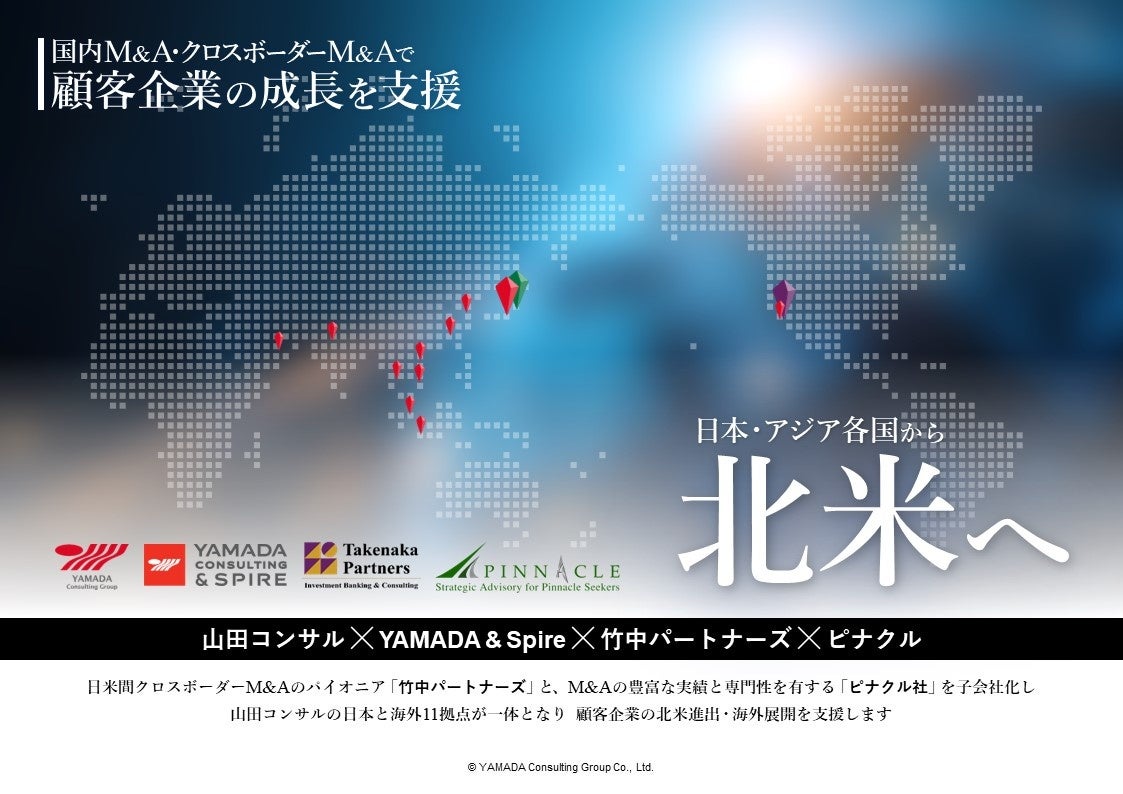 その中にあって、日系企業・アジア現地企業の成長戦略において、進出先として北米は最重要拠点であり、進出数・投資金額とも大きいわけですが、文化・洗練されたM&Aプロセス・スピードの速さに違いがあり、日系企業等にとって米国でのM&Aは難易度が高いのが実態です。それに対して、当社は2016年に竹中パートナーズと業務提携し「グリーンフィールドリサーチ(買い手企業の個別のニーズに応じて、市場や対象企業の調査・選定を行うリサーチ手法)」というM&A手法で日系企業の成長支援を行ってきました。今般、業務提携にとどまらず子会社化することにより、山田コンサルティンググループの日本および11の海外拠点が一体となって日系企業・アジア各国企業の北米進出、および北米企業の日本・アジア各国進出等をさらに推進できる体制となります。竹中パートナーズのCEO金井秀仁氏・会長ポール与那嶺氏と熱い想いを共有し、顧客企業の成長・発展のために邁進してまいります。