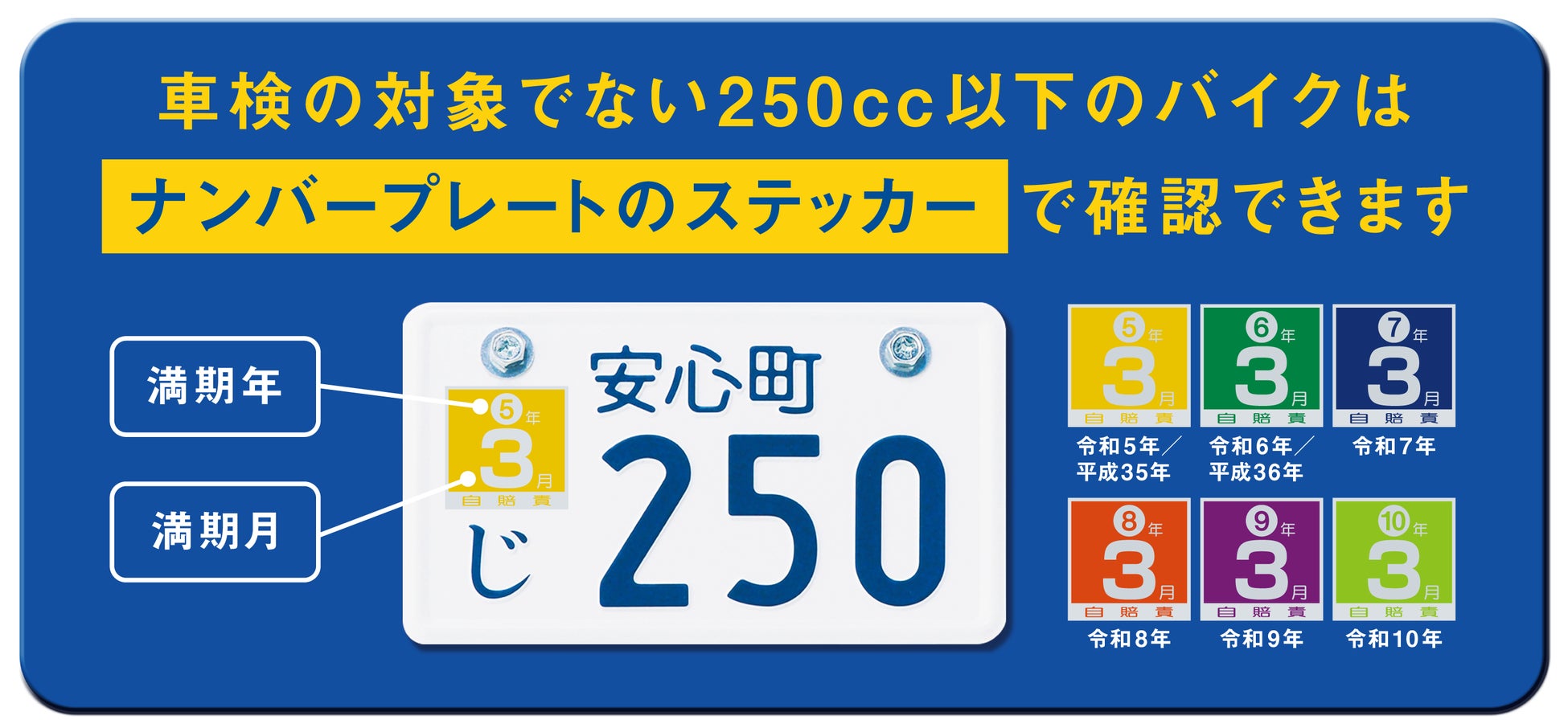 3.車検の対象でない250cc以下のバイクは、ナンバープレートのステッカーで確認できます。
