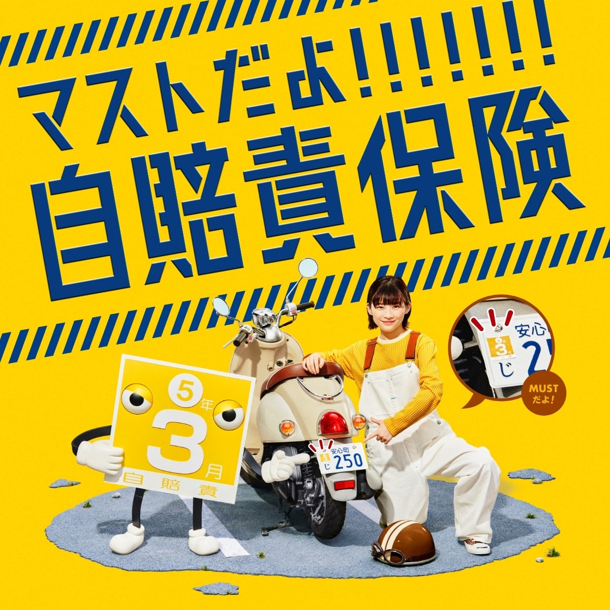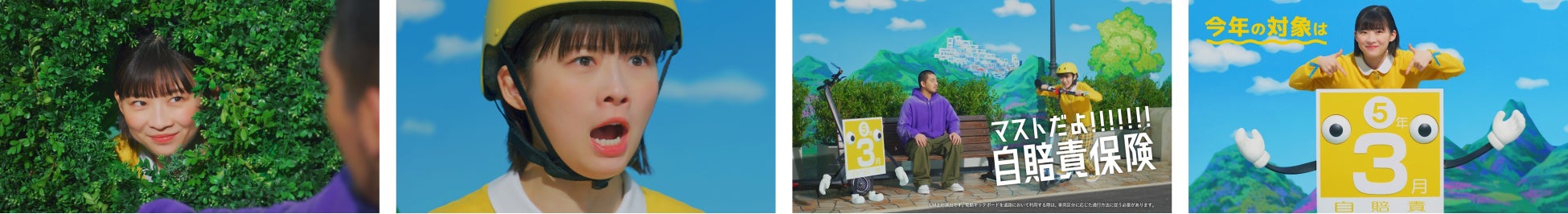 今年の更新対象カラーである黄色の“ステッカーくん”と“サイリさん(伊藤沙莉さん)”が、Z世代の3人「のんびりさん」「めんどうさん」「知らんかったさん」に『マストだよ!!!!!!! 自賠責保険』の決め台詞・決めポーズと共に、①期限切れは処罰の対象になること②更新はスマホで簡単にできること③電動キックボードを含む公道を走る全ての車両に加入義務があることなどを厳しくも優しく伝えていきます。サイリさんのキレのあるコミカルな動きやシリアスな演技にご注目ください。