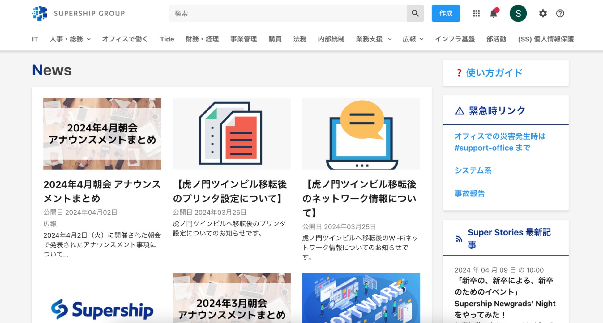 Supershipでは、様々なデジタルツールを活用して社内に必要な情報を従業員へ共有していましたが、当時使用していたポータルサイトを刷新する必要があり、新しいポータルサイトには、既存で利用しているデジタルツールを束ねる役割と、旧ポータルで課題となっていた検索機能の改善、さらに、ポータルサイトとしての枠組みを超えた社員同士の双方向コミュニケーションを実現する社内コミュニケーションプラットフォームの構築が必要でした。
