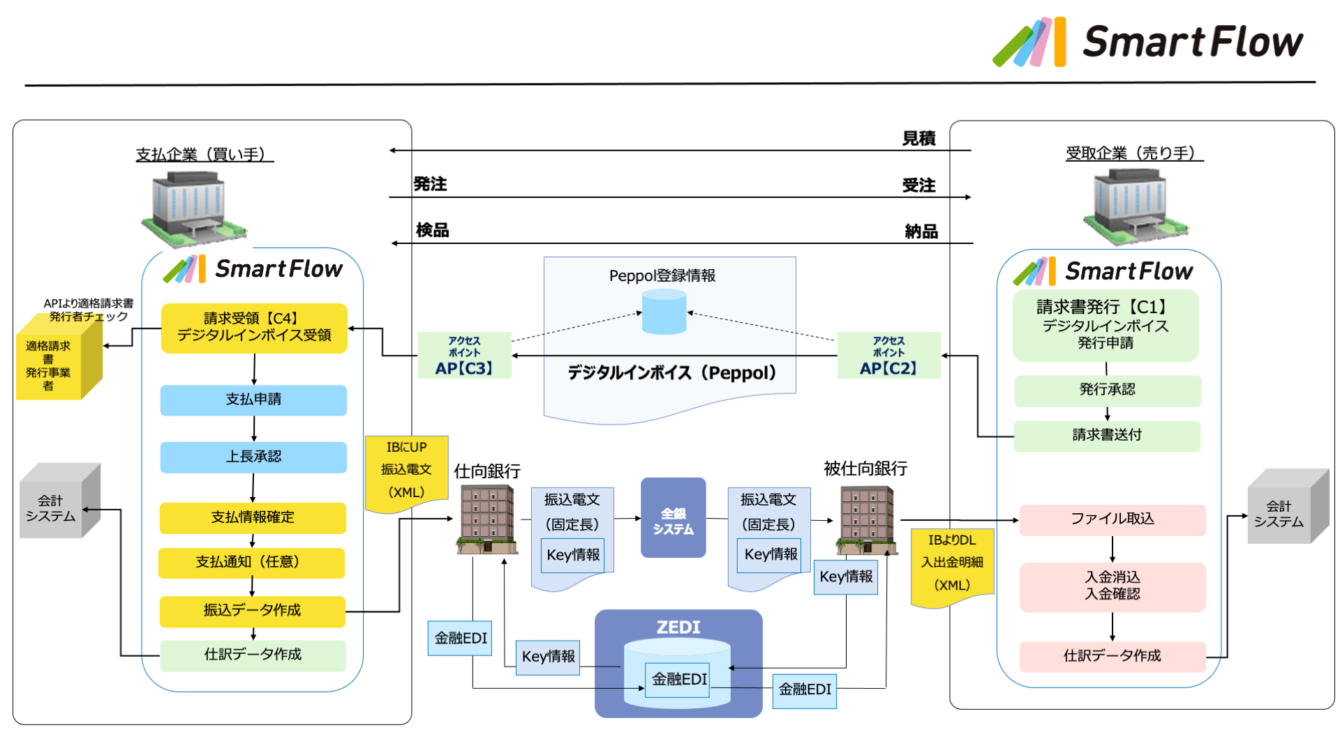 デジタルインボイスに対応し、紙やメールベースでの請求書の授受ではなく、データによる送受信を実現するとともに、社内の申請~承認プロセスを経た請求書については、SmartFlowから支払い業務までの実行が可能となります。
