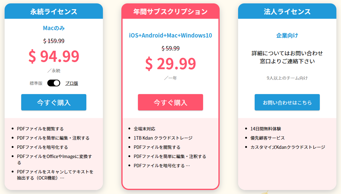 機能:全端末対応、1TB Kdan クラウドストレージ、PDFファイルの閲覧、編集、注釈付け、暗号化など