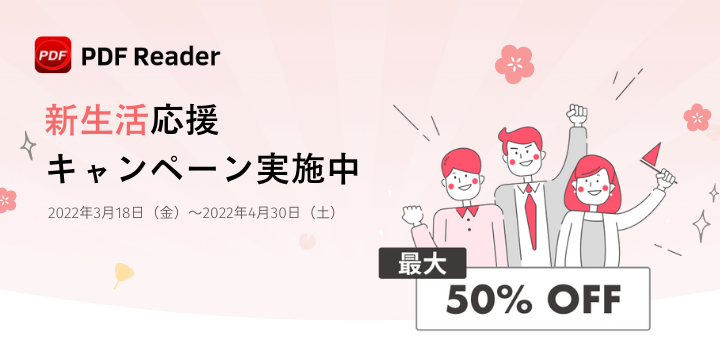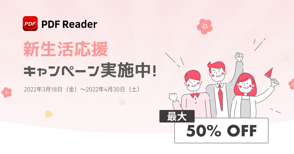 新生活を始める学生や新社会人の方々を応援するために、低価格で便利なPDF Readerを学校や職場で活用できるキャンペーンをご用意いたしました。特に大学生や大学院生は論文を読む・書く機会が多く、PDFファイルを閲覧・編集可能なアプリへの需要が高いかと思います。PDF Readerは学校でのプレゼンテーションにも活用することができます。