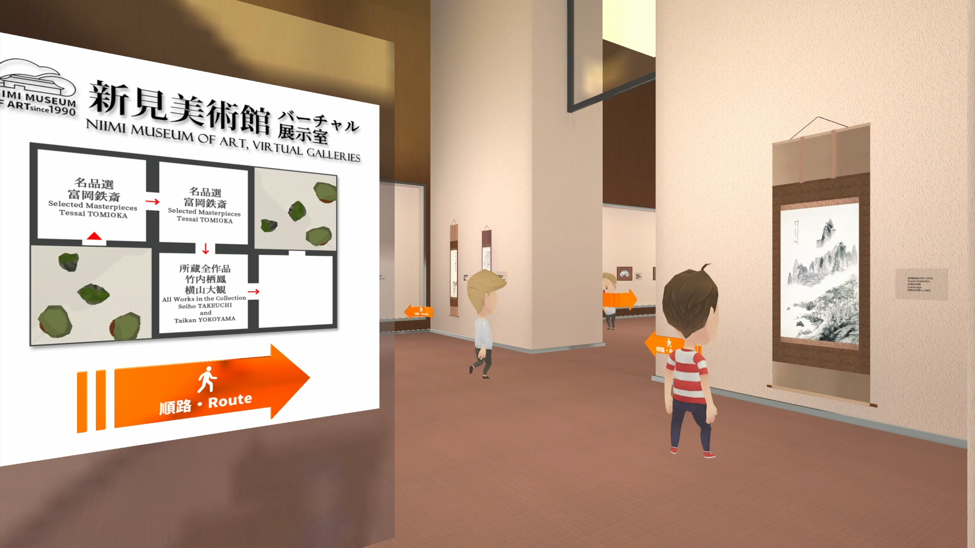 「新見美術館バーチャル展示室」には、新見美術館に所蔵する、富岡鉄斎の作品を中心に、竹内栖鳳、横山大観の作品を加え、総計45点の日本画をテーマとしたオンライン展示を行っています。インターネット空間に新見美術館に収蔵されている美術品の展示を行っており、利用者は24時間365日・無料で美術作品の鑑賞が可能です。