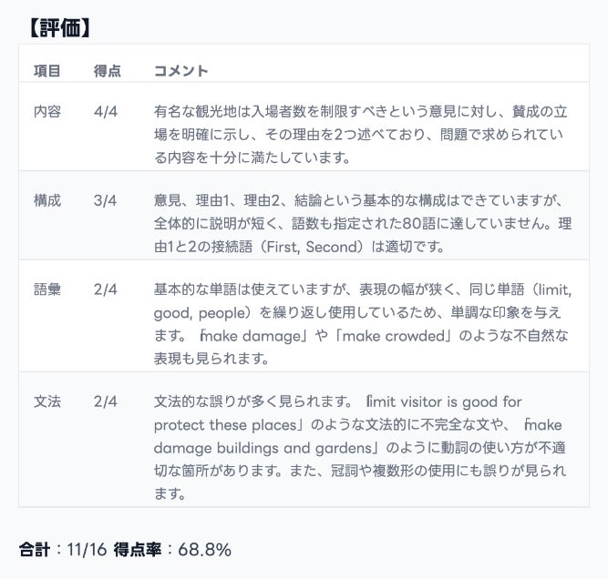 従来のシステムでは「あなたの得点」「こうすればもっと良くなる」という抽象的なアドバイスが主でした。今回の改修では、実際の英文をどう書き直せば良いかを具体的に示し、どの単語や文法をどう修正したか、なぜその表現が適切なのかを日本語で詳しく解説します。