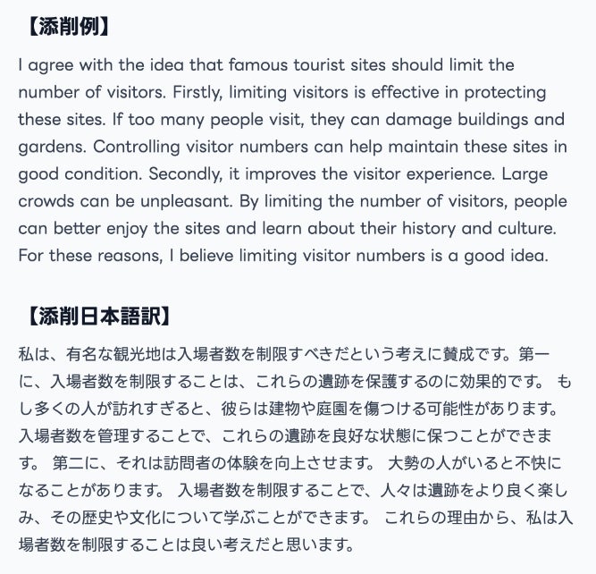 → 今回の改修で、自動詞と他動詞の使い分けに特化した指摘を行い、受験生が「目的語を伴わない動詞」と「目的語が必須の動詞」を整理しやすくしました。文法書を見るだけでは気づきにくいこのポイントに対して具体的な修正提案が提示されるため、作文品質の向上が期待できます。