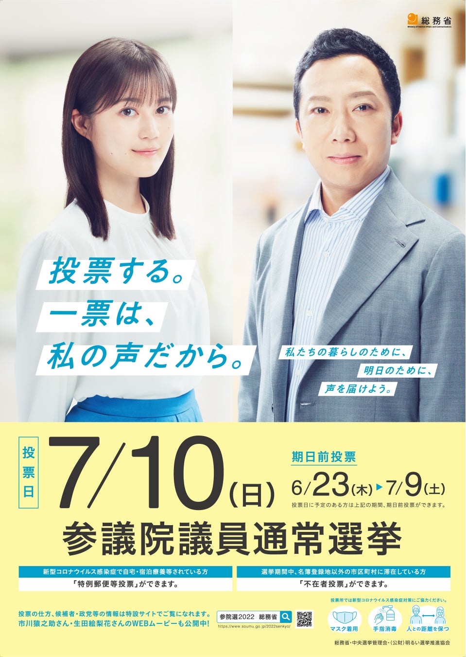 今回の参議院議員通常選挙は、グループを卒業し、今年から新たに個人で活動され、若い世代から人気の高い生田絵梨花さんと、歌舞伎俳優として活躍し、男女問わず幅広い年代から支持を集める市川猿之助さんの2名を選挙啓発のイメージキャラクターに起用し、若年層はもとより、幅広い世代に投票参加を呼びかけ、有権者に親近感を感じてもらうことをねらいとしています。