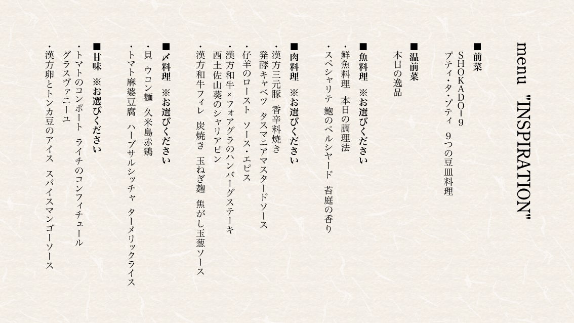 コ ー ス :ランチ 3,800円/5,800円/9,800円、ディナー 6,800円/9,800円/18,000円 (消費税・サービス料別)