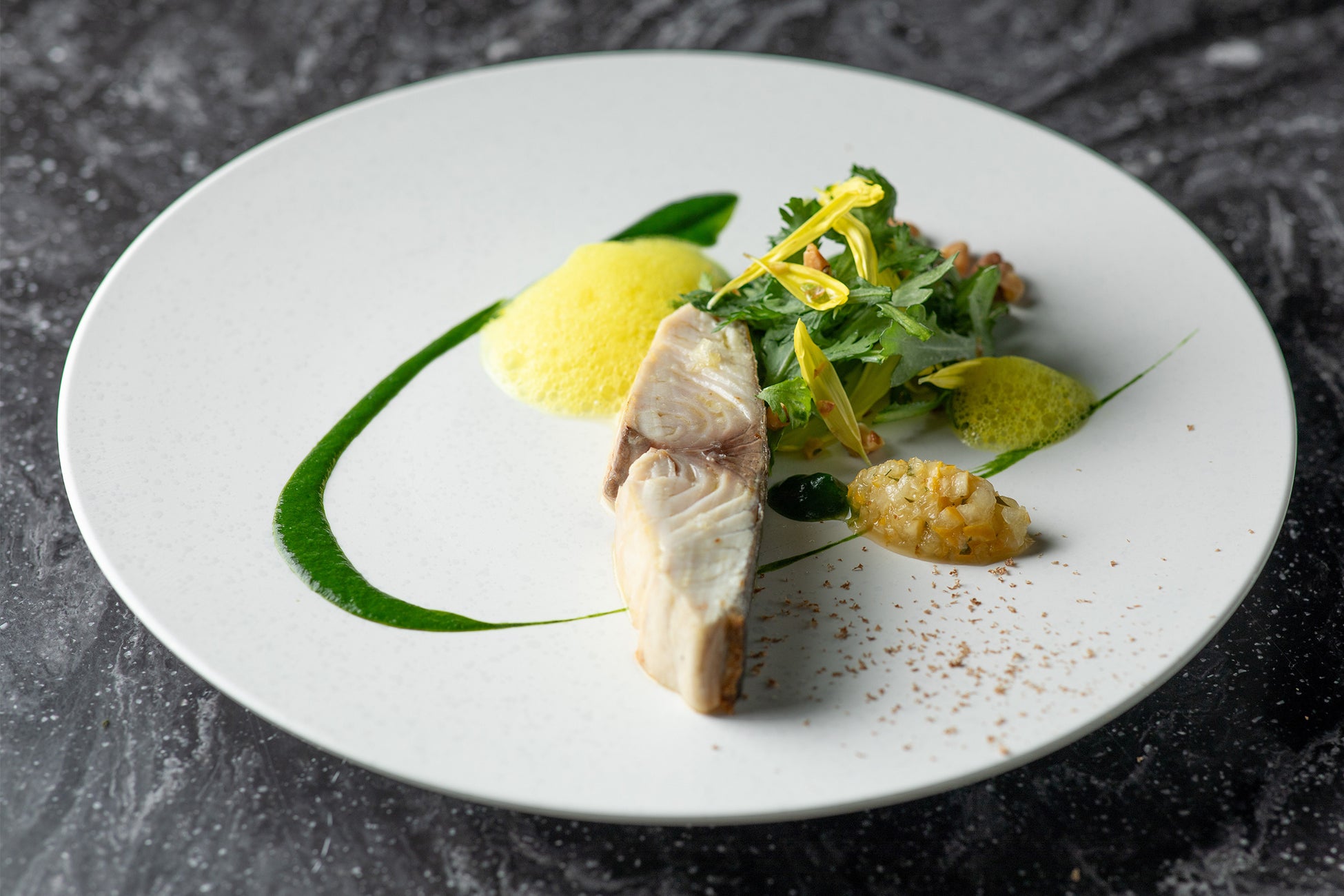 4月から提供中のコースでは、シェフが得意とする魚料理に春を告げるサワラを使い、春を意識した色彩と味わいに仕上げたり、漢方和牛フィレと淡路島新玉葱のキャラメリゼの「赤×黒」のコントラストを皿の「赤×黒」の色合いにマッチングさせたりと、繊細さと大胆さを兼ね揃えた五感をくすぐる品々を提供しています。
