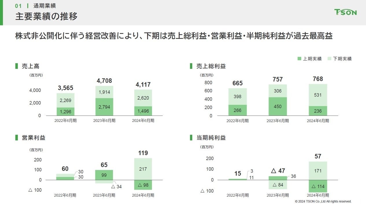 株式会社TSON 2024年6月期決算発表 営業利益82.7%増 下期は売上総利益・営業利益・半期純利益が過去最高益