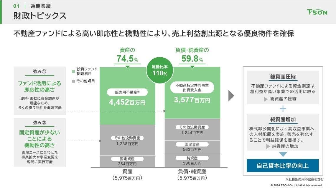 不動産ファンドによる高い即応性と機動性により、売上利益創出源となる優良物件を確保しております。当社の強みとしましては「ファンド活用による即応性の高さ」と「固定資産が少ないことによる機動性の高さ」にあります。この強みを活かしファンドによる資金調達を粗利益の高い事業に絞ることで、総資産を圧縮しながらも純資産を増加させ自己資本比率の向上を目指してまいります。