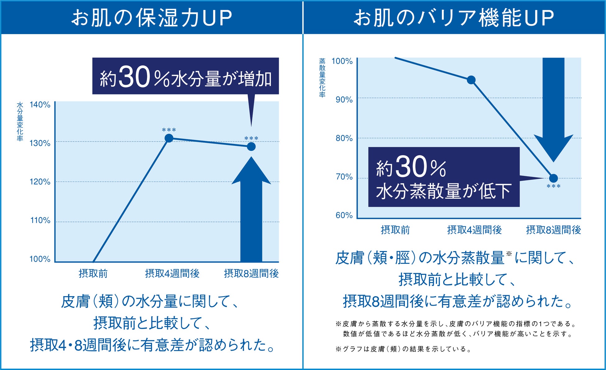 摂取前と比較して、摂取8週間後に頬の水分量の増加および水分蒸散量の低下が見られ、生きて腸まで届く植物乳酸菌「マイ・フローラ乳酸菌MF3*」を含む乳酸菌発酵ゼリーがお肌の保湿力・バリア機能を改善する結果が得られた。また、水分蒸散量に関しては、頬だけでなく脛でも同様の結果が得られた。