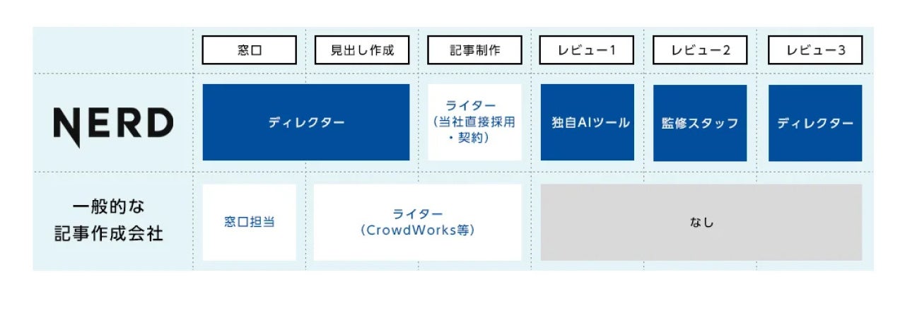 NERDの記事制作サービスは、独自のノウハウで、必要なキーワードを盛り込みつつ、ユーザーの検索ニーズを満たす記事を書くことで、継続して上位を狙うことができる「長期的な資産となる」記事制作を行います。