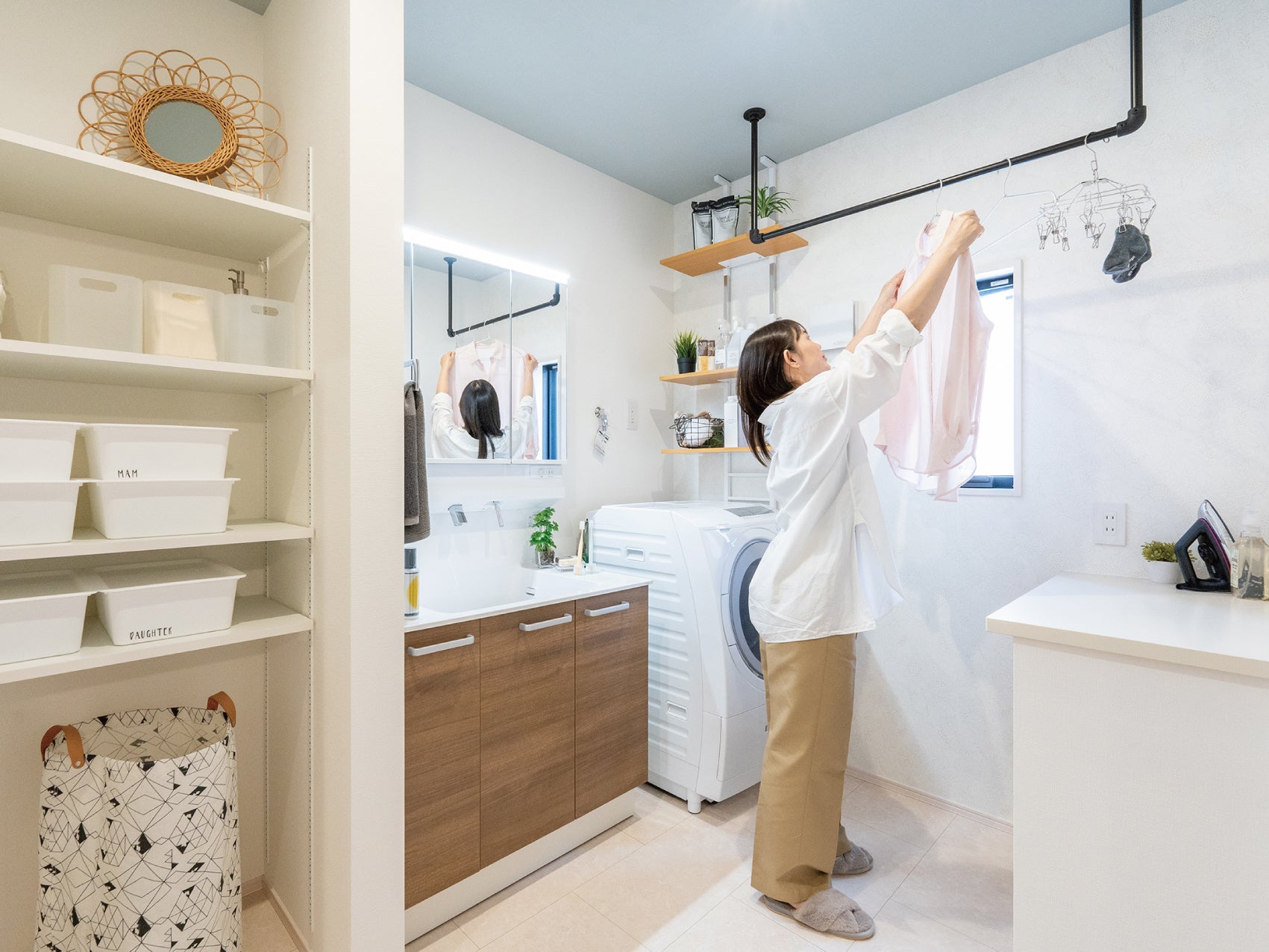 洗う→干す→たたむの3ステップが一カ所で完結し、洗濯の時短に役立つ「ラク家事ランドリー」や、キッチンなどの水廻りを2階に集約することで家事の効率化が実現。忙しいご家庭でもストレスのない暮らしを。