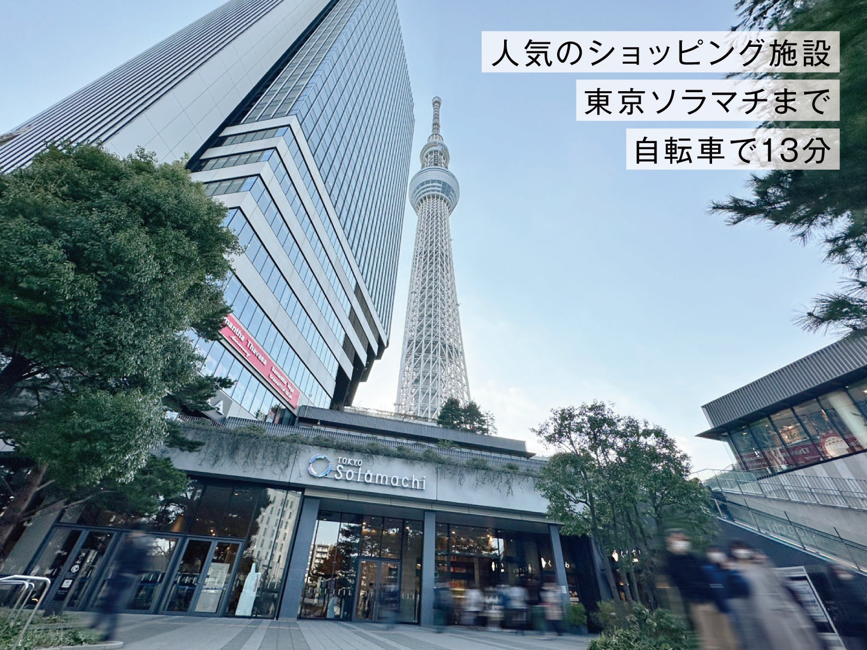 東武スカイツリーライン「東向島」駅から徒歩3分。通勤・通学や日用品の買い物が便利なだけでなく、人気のショッピング施設「東京ソラマチ」までも自転車で行けてしまう好立地。