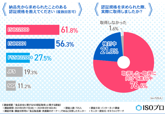 今回の調査結果で、食品製造業・流通業において、食品の安全な製造・取り扱いを保証する「ISO 22000」や「ISO 9001」と、納品先から求められることの多い認証規格が明らかになりました。