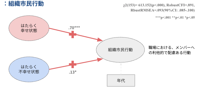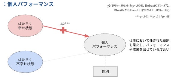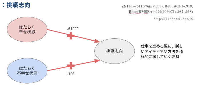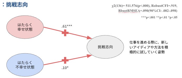 「全国における調査と同様に、東北においてもはたらく幸せは『挑戦志向』や『ジョブ・クラフティング』『ワーク・エンゲイジメント』等にポジティブな影響を与えていることが明らかとなり、就労における幸せのポジティブな効果が示された」