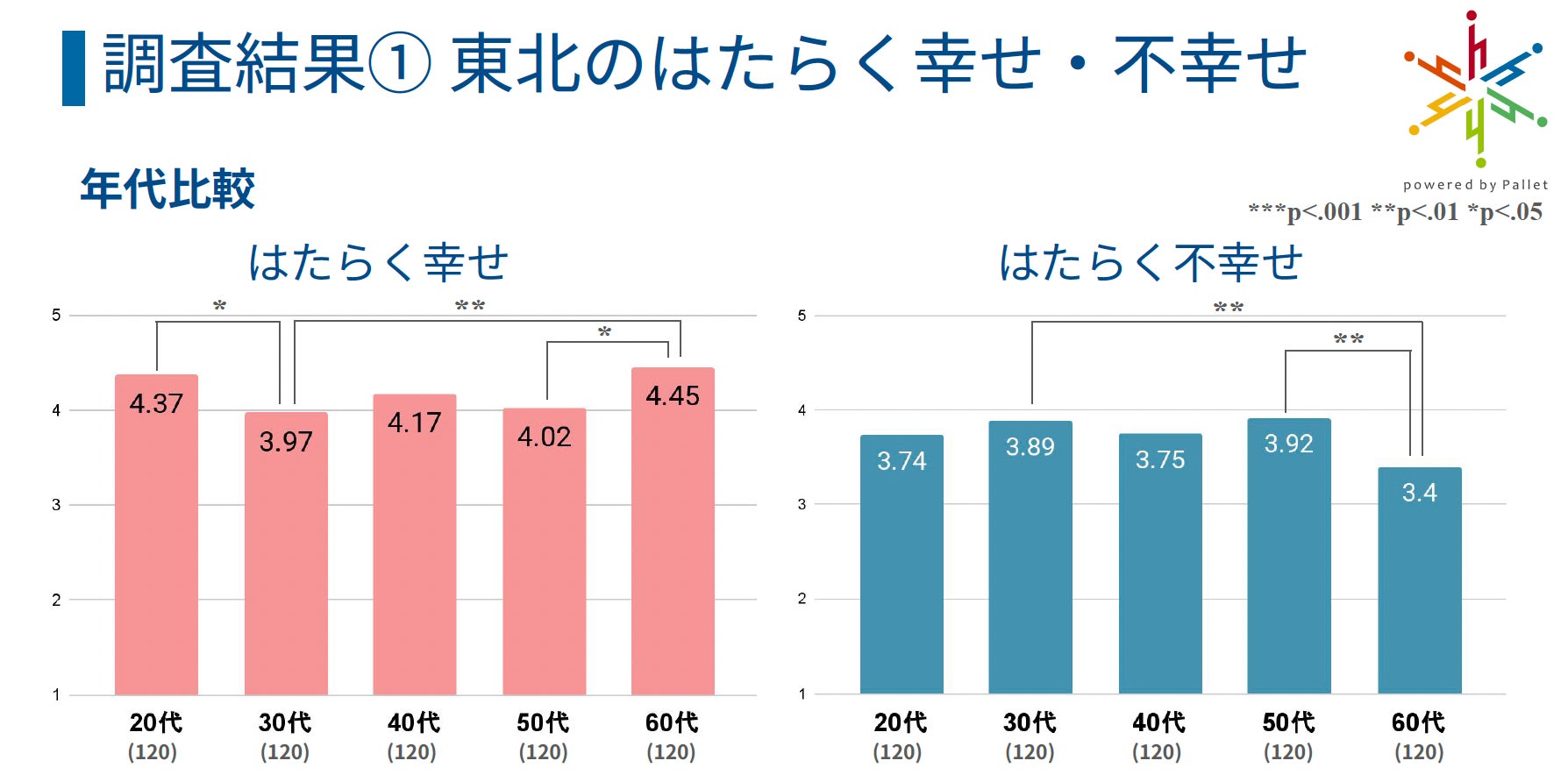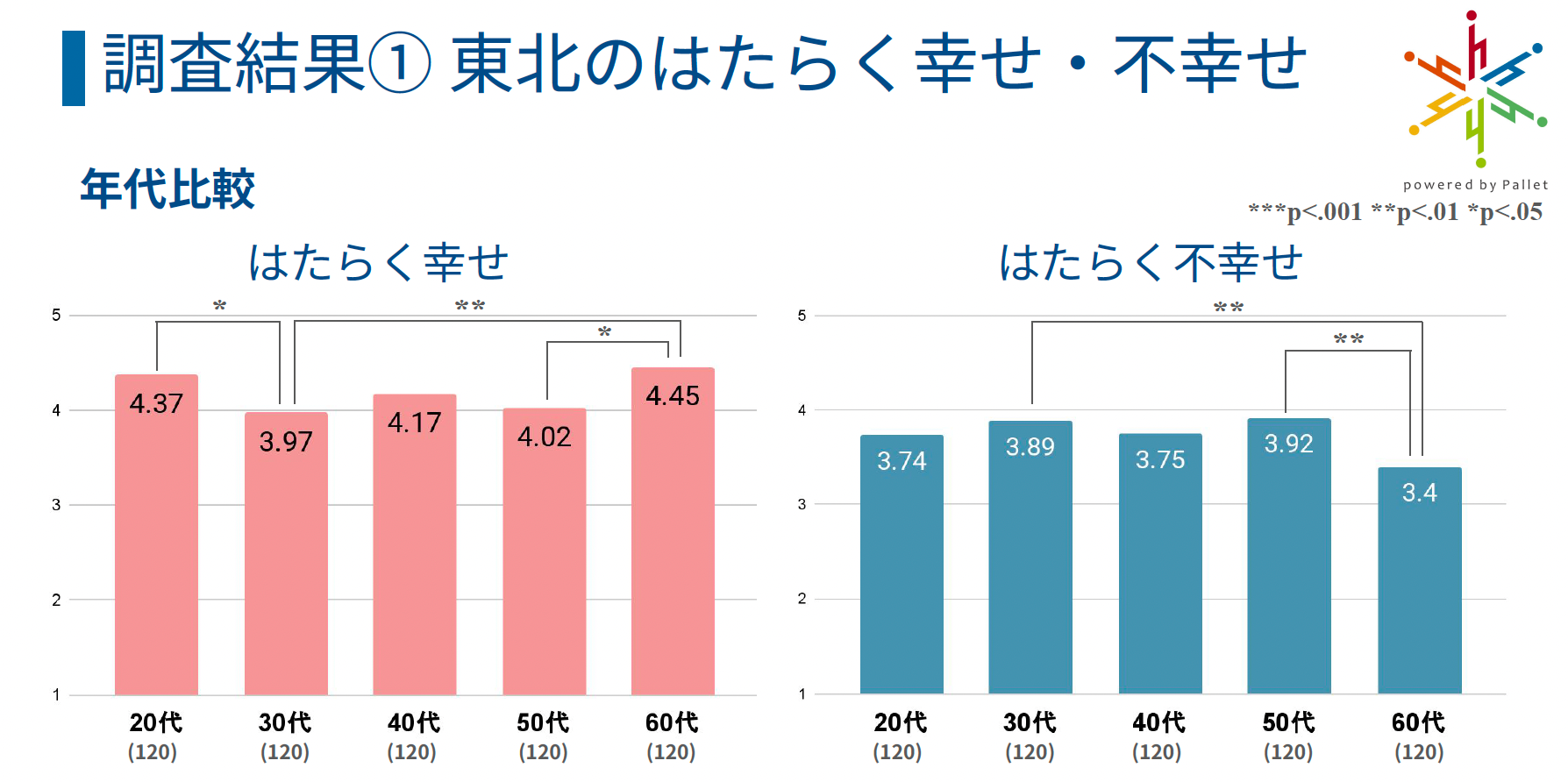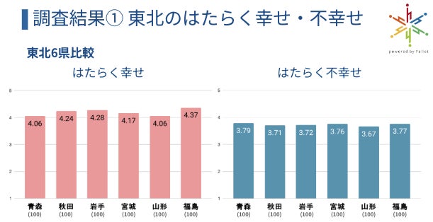 株式会社Pallet(所在地:仙台市、代表:羽山暁子)のシンクタンクである東北はたらく幸せ研究所(以下はたラボ)は、東北地方で勤務する人を対象に「はたらく幸せ」に関する調査を実施しました。調査の結果、東北におけるはたらく幸せ・不幸せの特徴が明らかになり、東北においてもはたらく幸せがポジティブな影響をもたらすこと、首都圏と比較し「人間関係に関連する不幸せ」が強いといった特徴が示されました。本調査は、企業の人材定着施策や地域の雇用政策に活用できる基盤データとして、今後企業や自治体、経済団体との共創のもとで継続的な発信を行ってまいります。