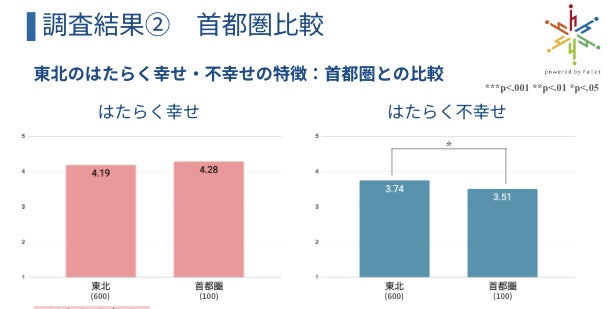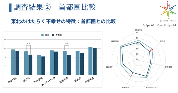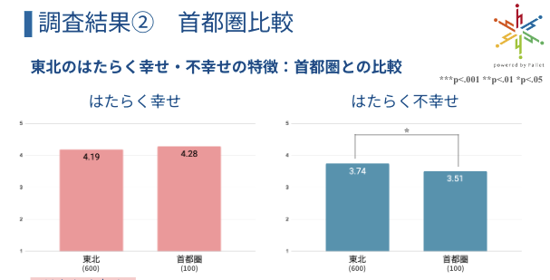 「東北6県間では、はたらく幸せ・不幸せに有意な差はなく共通する傾向が見られたが、東北と首都圏で比較すると、はたらく不幸せにおいて東北が高いことが明らかになった。東北のはたらく不幸せを特に高めている要因は『理不尽(ハラスメント因子)』と『協働不全(職場バラバラ因子)』という人間関係に起因するものであった」