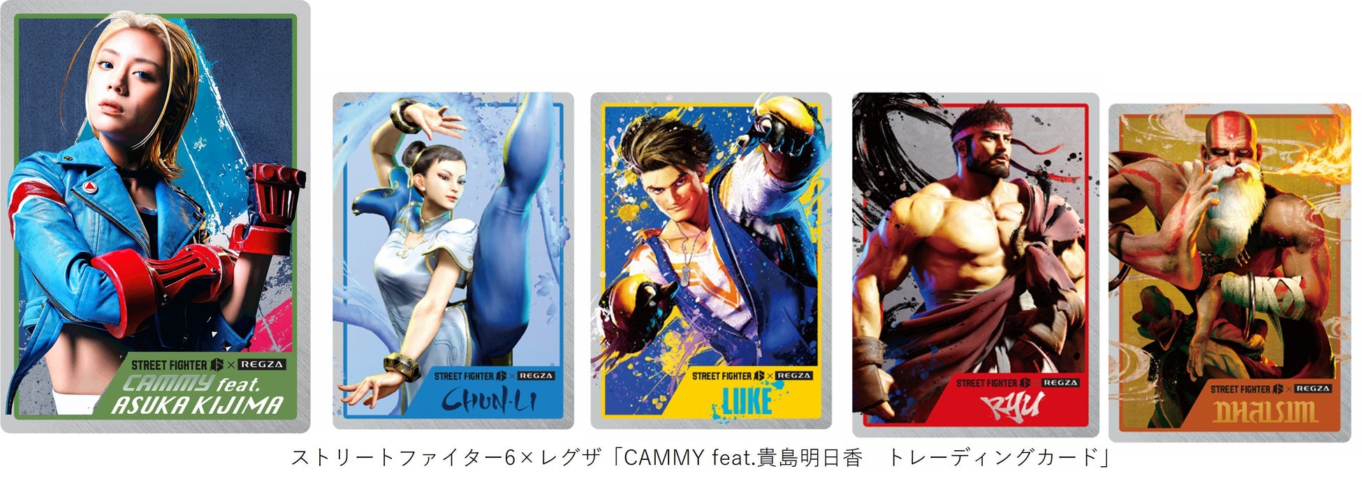 また、『ストリートファイター6』のキャラクターをモチーフにしたトレーディングカードのプレゼントキャンペーンも実施します。トレーディングカードの種類は、貴島明日香さんが『ストリートファイター6』の人気キャラクター「キャミィ」扮したカードに加え、「ルーク」「春麗」「リュウ」「ダルシム」など全5種類。東京ゲームショウ2023の『ストリートファイター6』コーナーで試遊いただいた方やTVS REGZA主催のSNSキャンペーンなどで配布をします。トレーディングカードの制作過程も、期間限定公開のスペシャルコンテンツにてご確認いただけます。