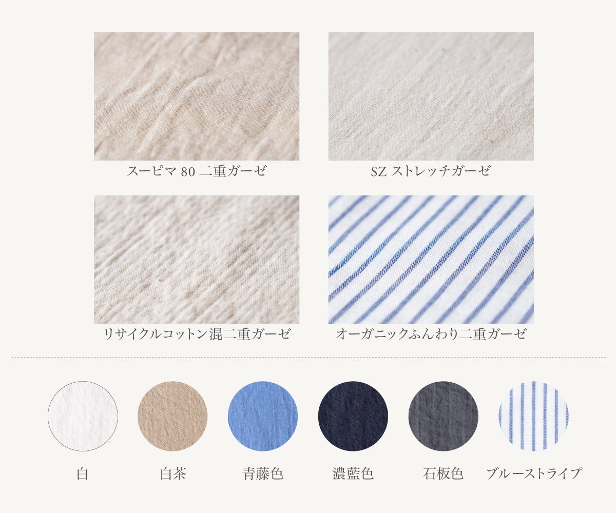 素材は、肌触りの良さや、軽さに拘わった4種のガーゼで、全てオリジナル。