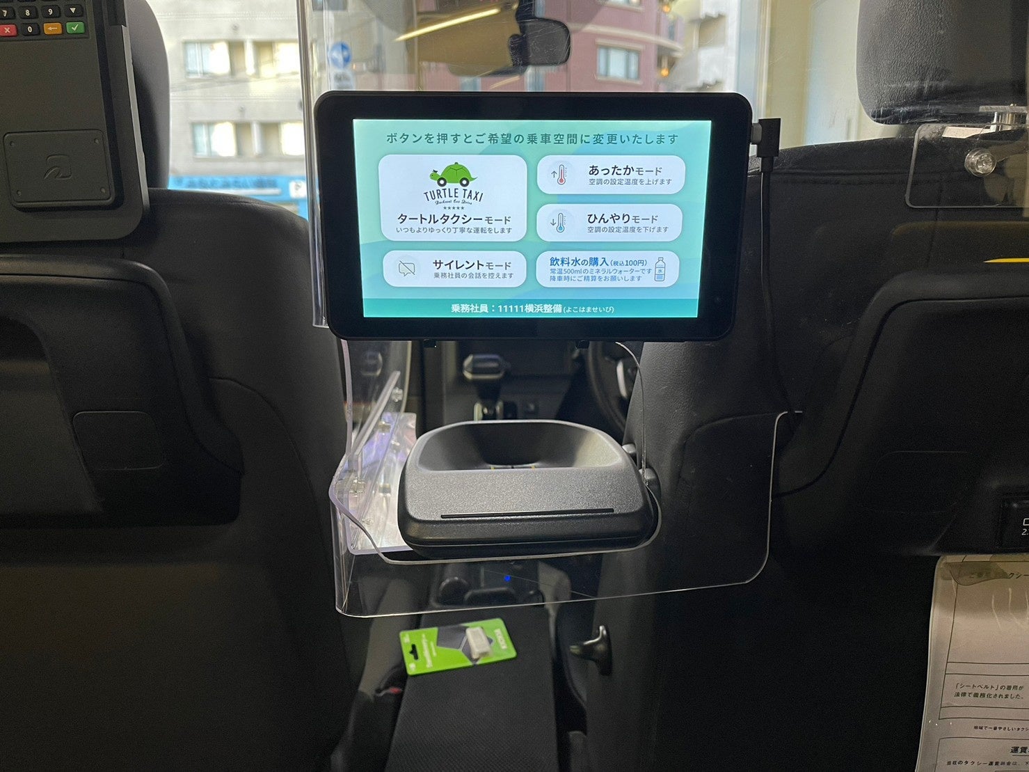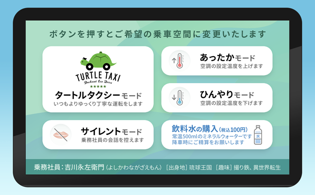 今回、ボタンから新たにタブレット化することによって、「タートルタクシーモード」に加えて空調設定の「あったかモード」「ひんやりモード」、話しかけないでほしい方向けの「サイレントモード」、三和交通オリジナル飲料水の購入が直接お話し頂かなくても可能となります。東京営業所を除く全車両で運行し、よりスマートなタクシーのサービスを実現いたします。