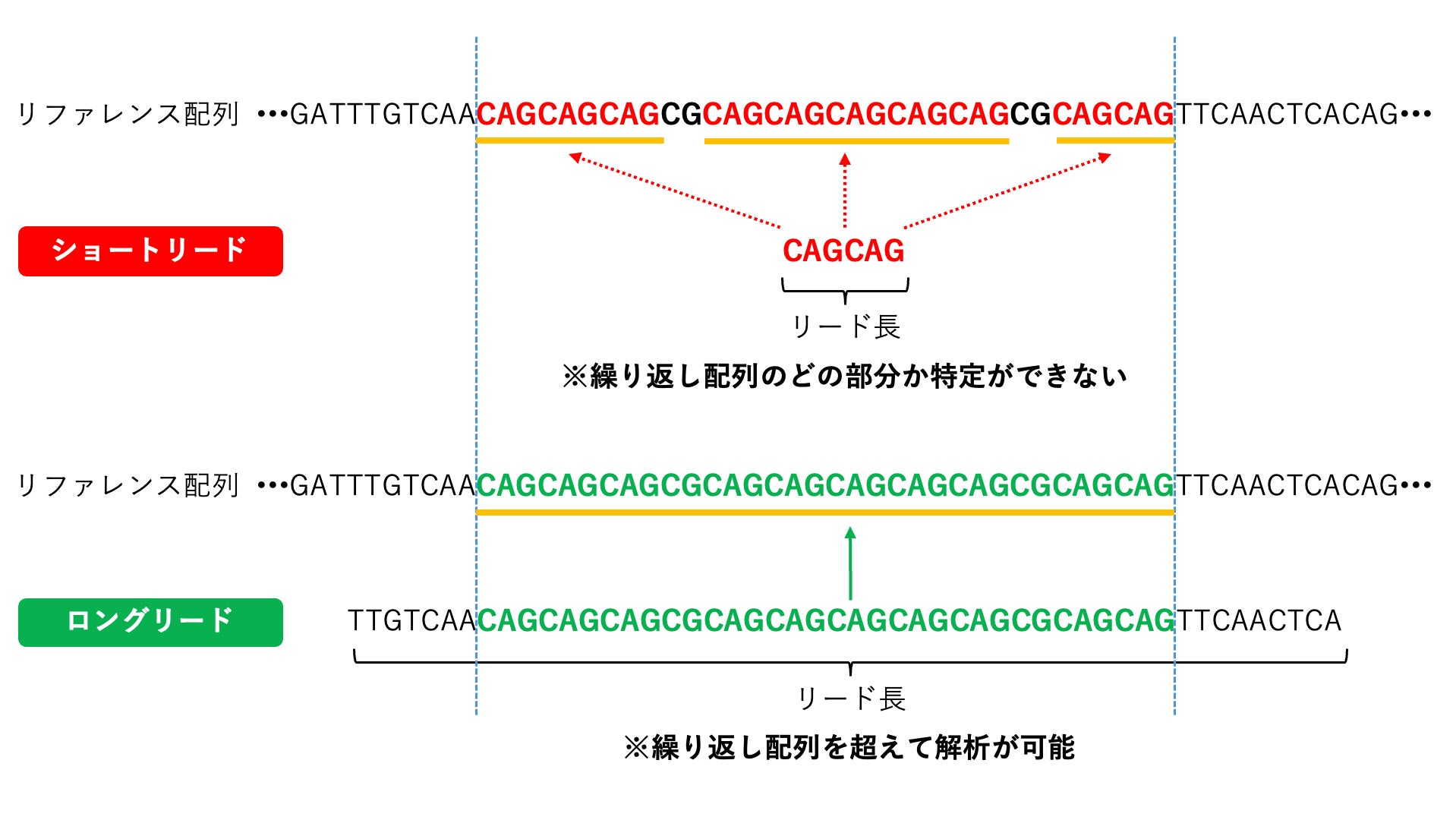 現在、全ゲノム解析が可能な次世代シーケンサー(NGS)には、米国イルミナ社らが提供するショートリードシーケンサーと、米国パシフィック・バイオサイエンス・オブ・カリフォルニア(PacBio)社らが提供するロングリードシーケンサーの2種類があります。これまでは解析の精度や費用等の面からDNAを数百塩基の非常に小さな断片に切断し、それぞれを個別に解析するショートリードシーケンサーが主流となってきました。しかし、大きな欠失・挿入や重複、長いリピート伸長、逆位、転座等の複雑な構造バリアント(SV)の検出は難しいため、数千〜数十万塩基の長い状態のままDNA配列を読み取り、SVも含めてより多面的に解析できるロングリードシーケンサーに注目が集まっています。