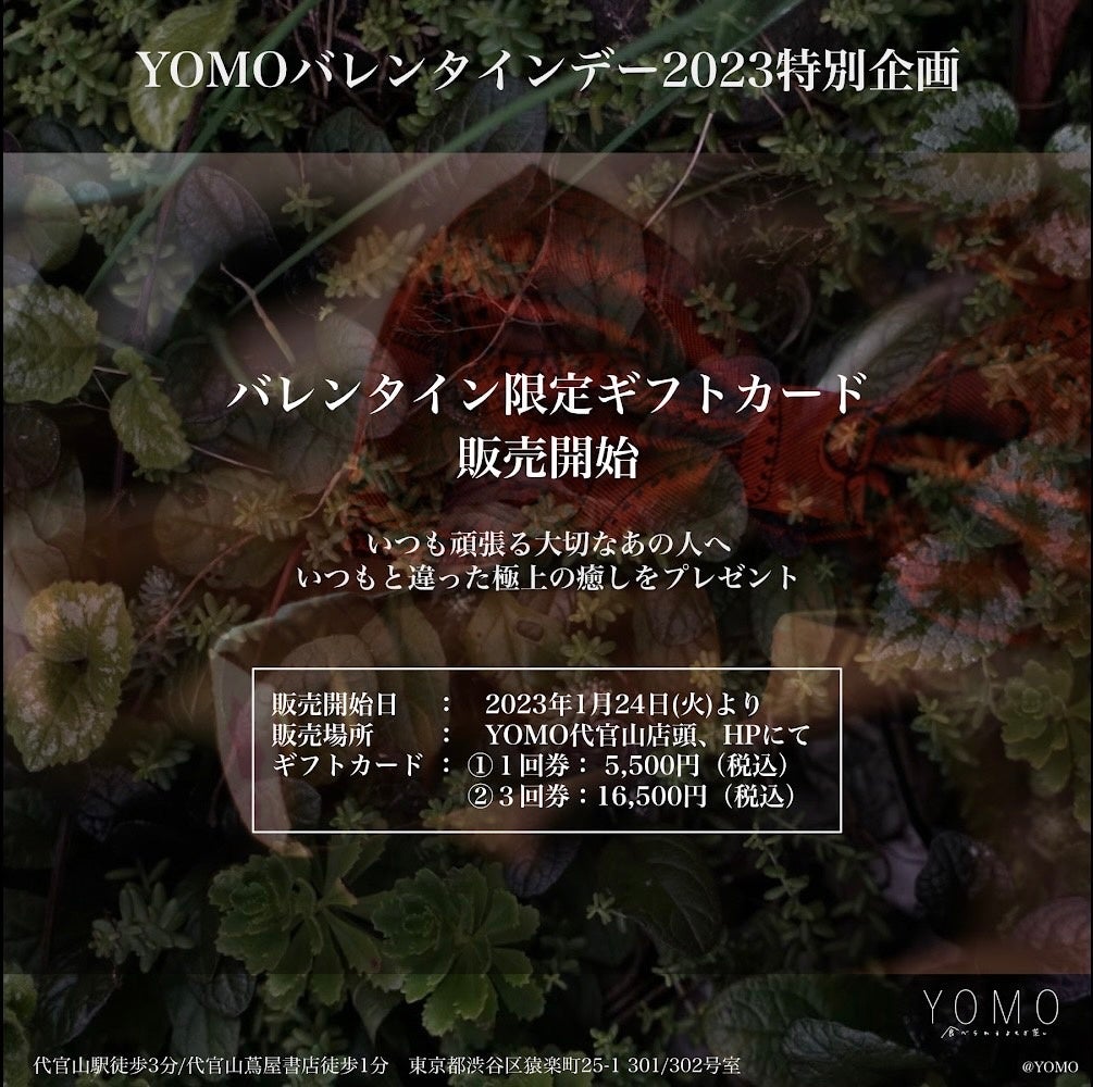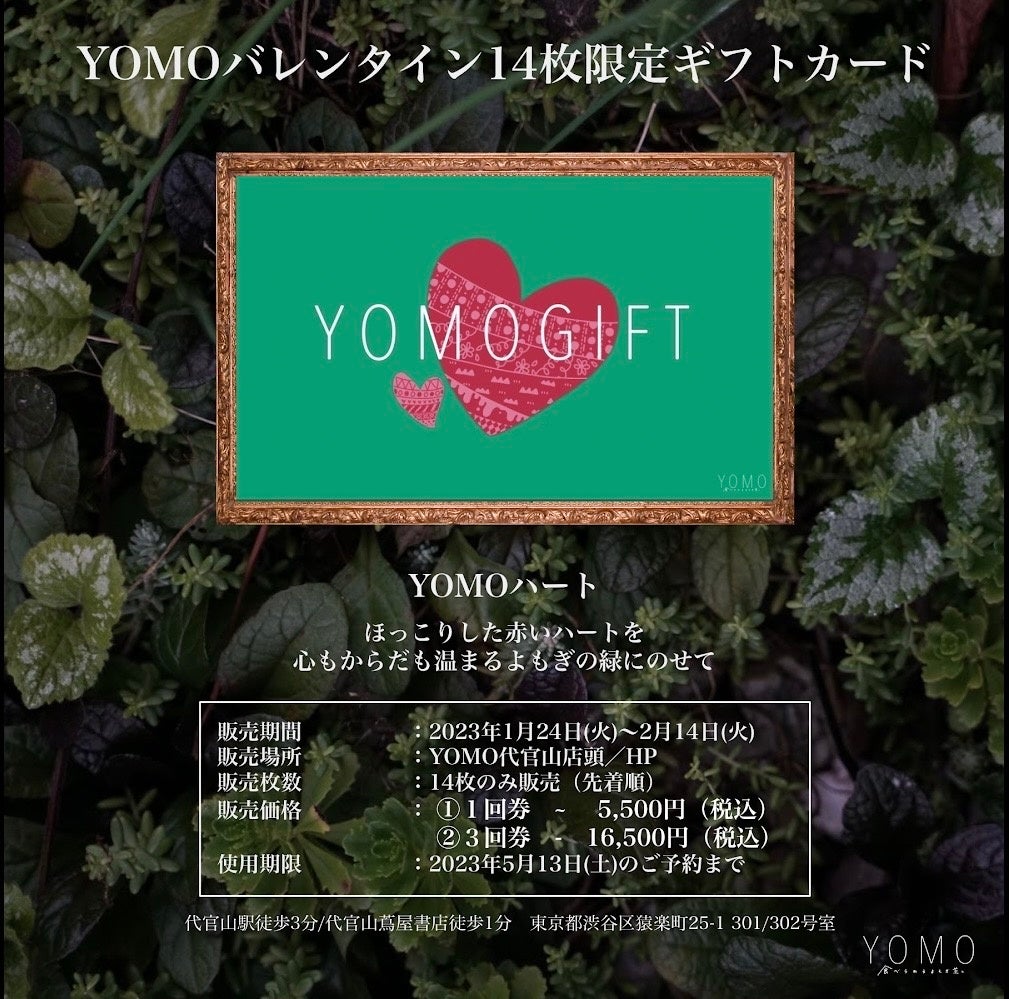 バレンタインデー2023特別企画!『1色限定デザイン14枚!』初ギフトカード6種類販売開始!代官山よもぎ蒸しサロン「YOMO」