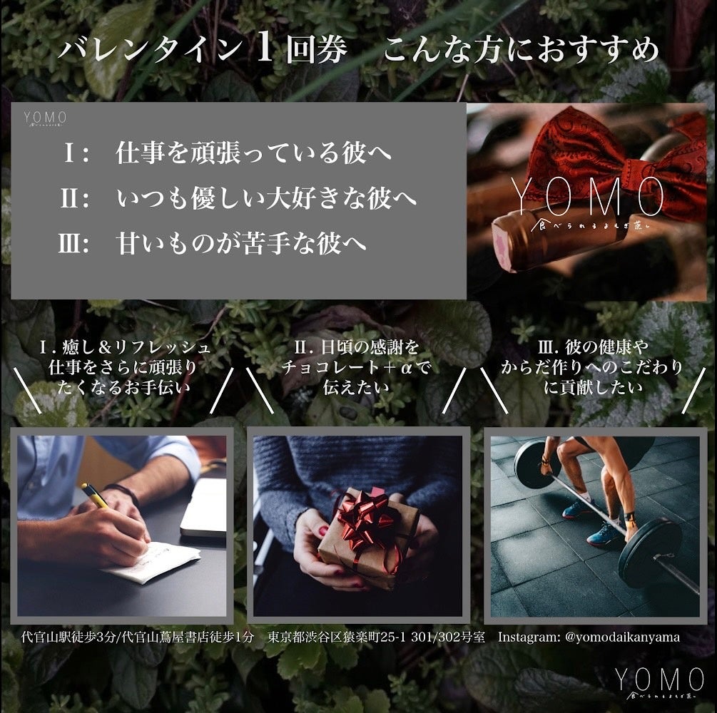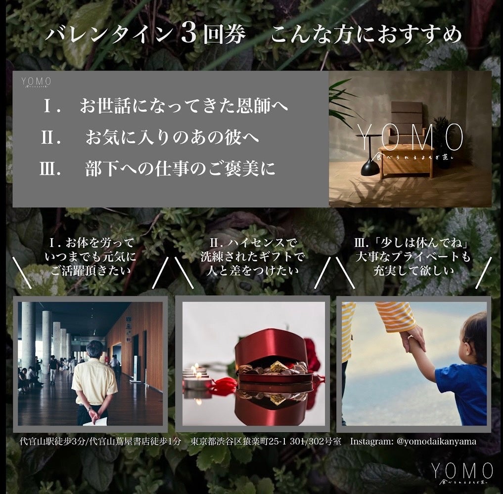 代官山駅徒歩3分/代官山蔦屋徒歩1分の「YOMO〜食べられるよもぎ蒸し〜」は、1月24日(火)よりバレンタインのプレゼントにぴったりなギフトカード『YOMOギフト』の販売開始。